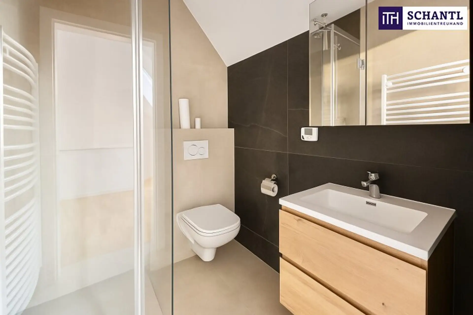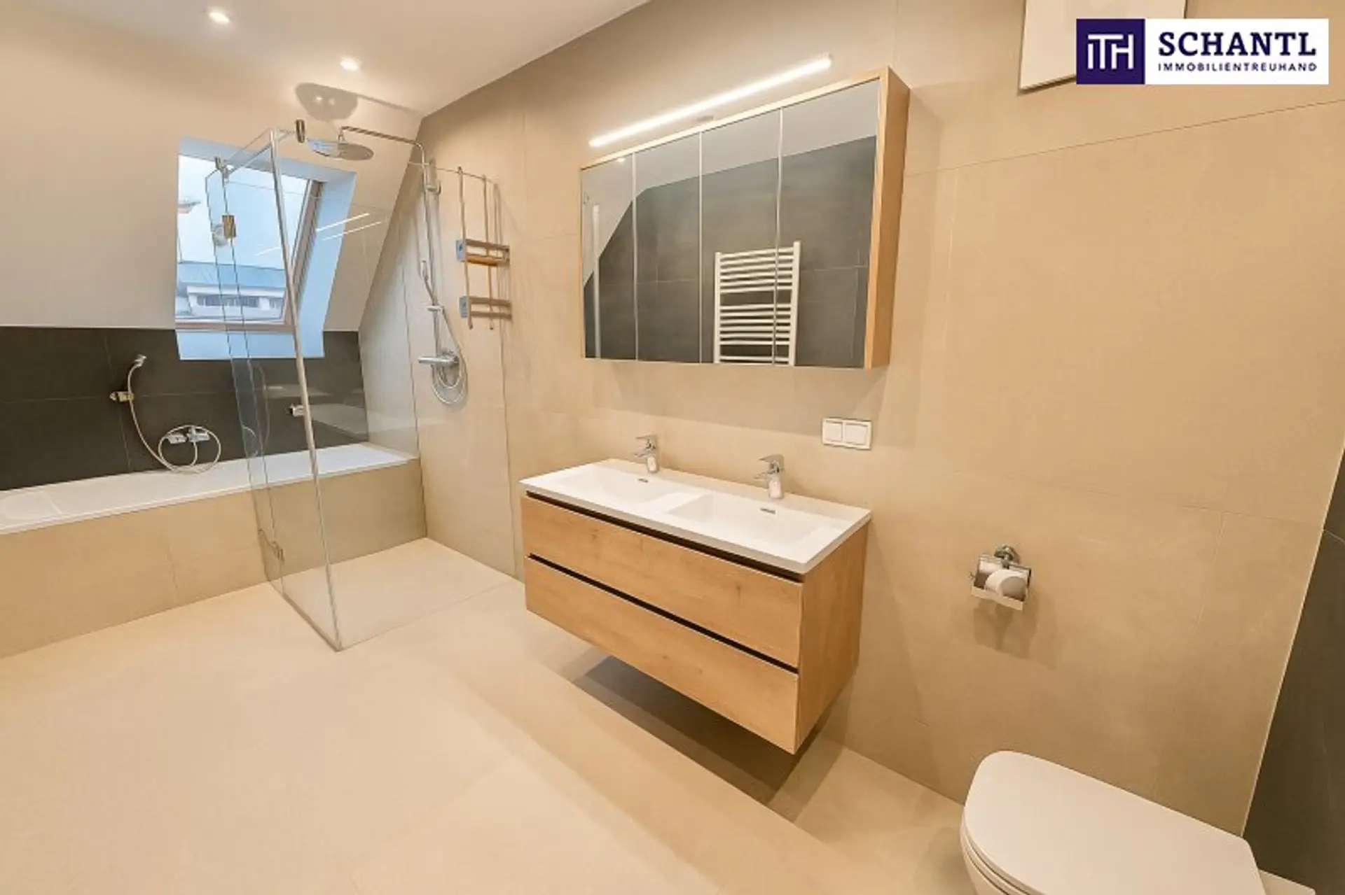 Das Badezimmer mit Badewanne, Dusche, WC und Tageslichtfenster überzeugt durch hochwertige Ausstattung und geschmackvolles Design. Ein Abstellraum mit Waschmaschinenanschluss sowie ein separater Einlagerungsraumergänzen das Raumangebot.