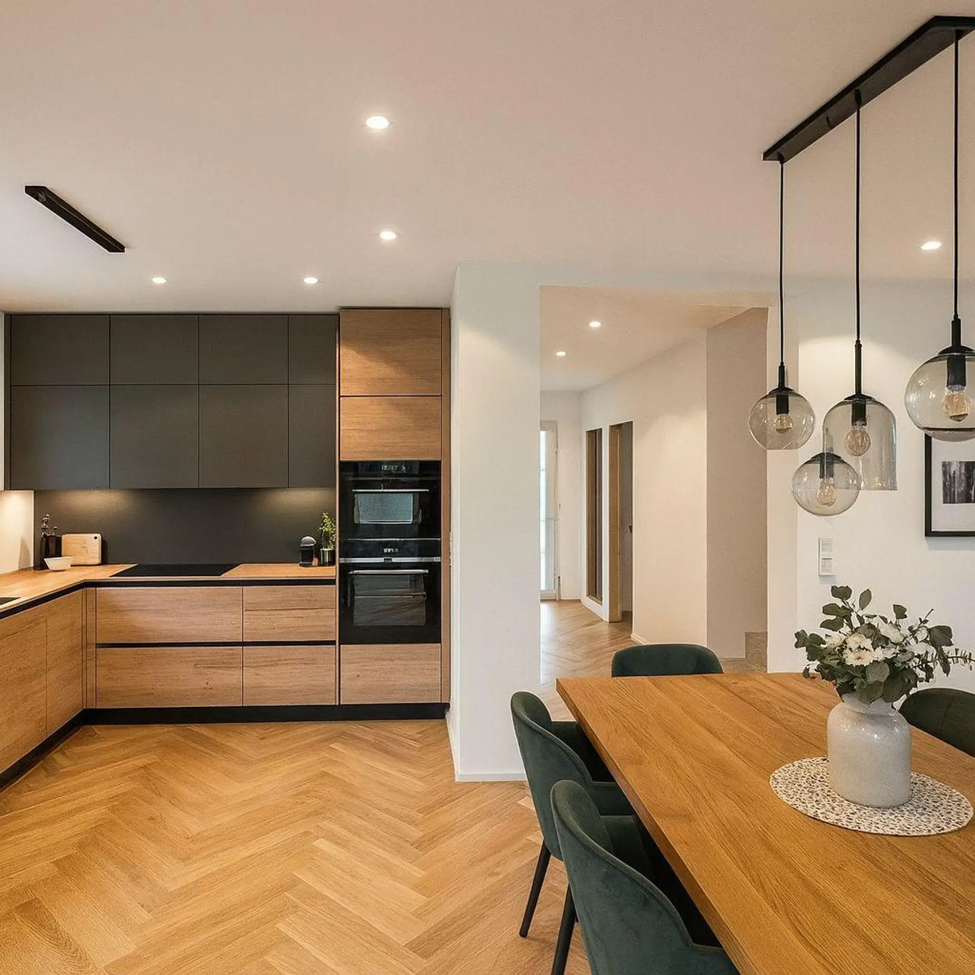 Im hinteren Bereich liegt die helle, offen gestaltete Wohnküche mit einem gemütlichen Essbereich.