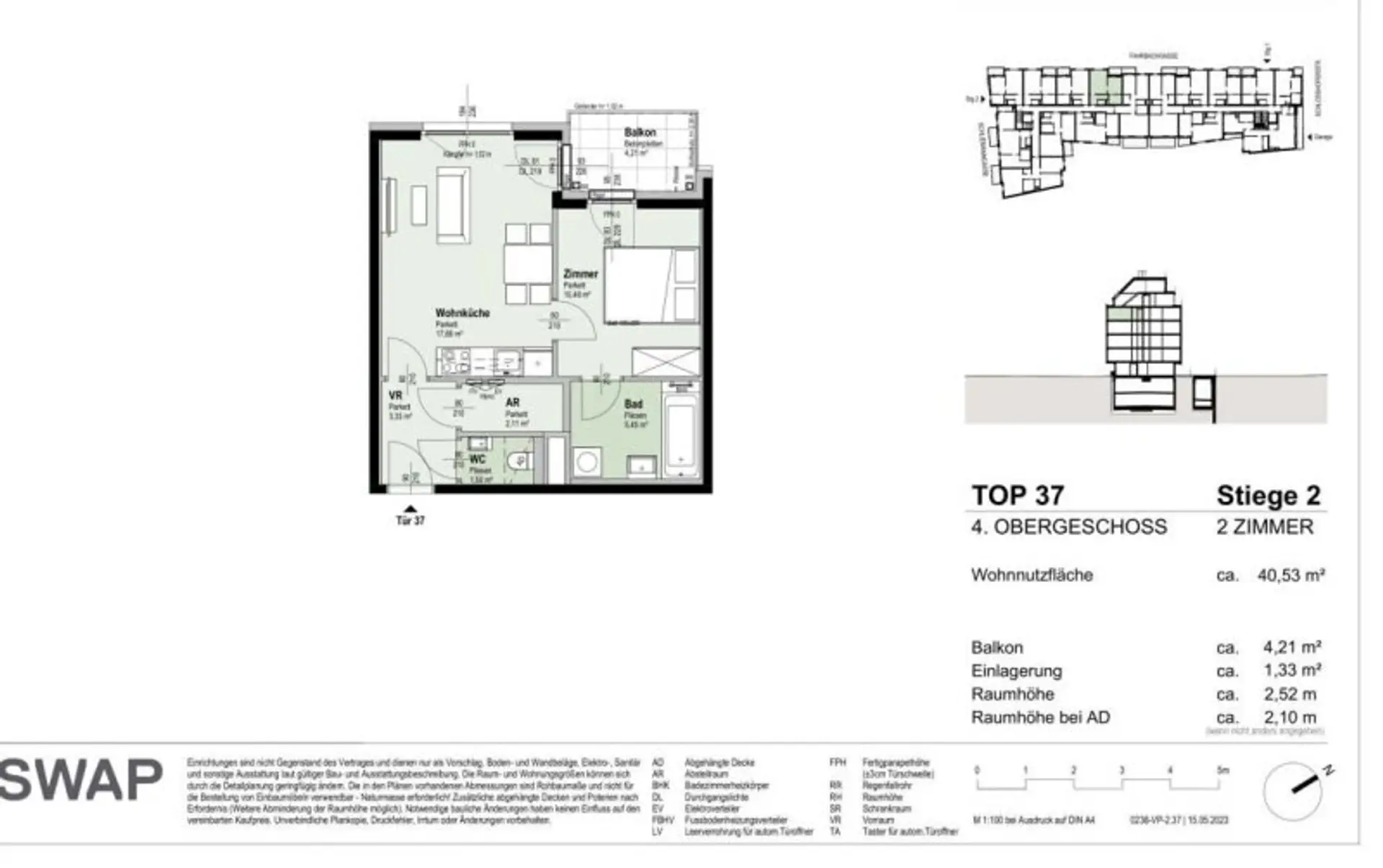 Wohnungsbeschreibung Stiege 2 - TOP 37 mit ca. 40,53 m² Wohnfläche plus Balkon befindet sich im 4. Liftstock: