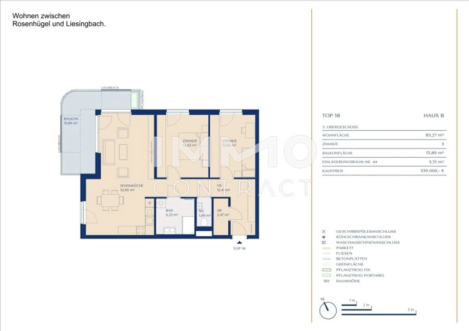 Ausstattung: Barrierefrei Boden Fahrstuhl Wohnküche / offene Küche Bad Kabel/Satelliten-TV Klimaanlage Tiefgarage Parkplatz Fahrradraum Abstellraum Fußbodenheizung Balkon