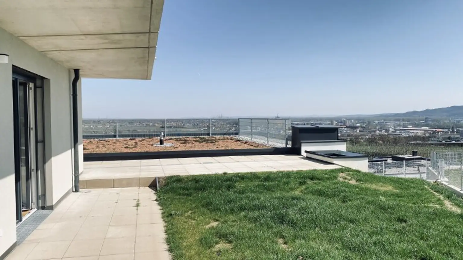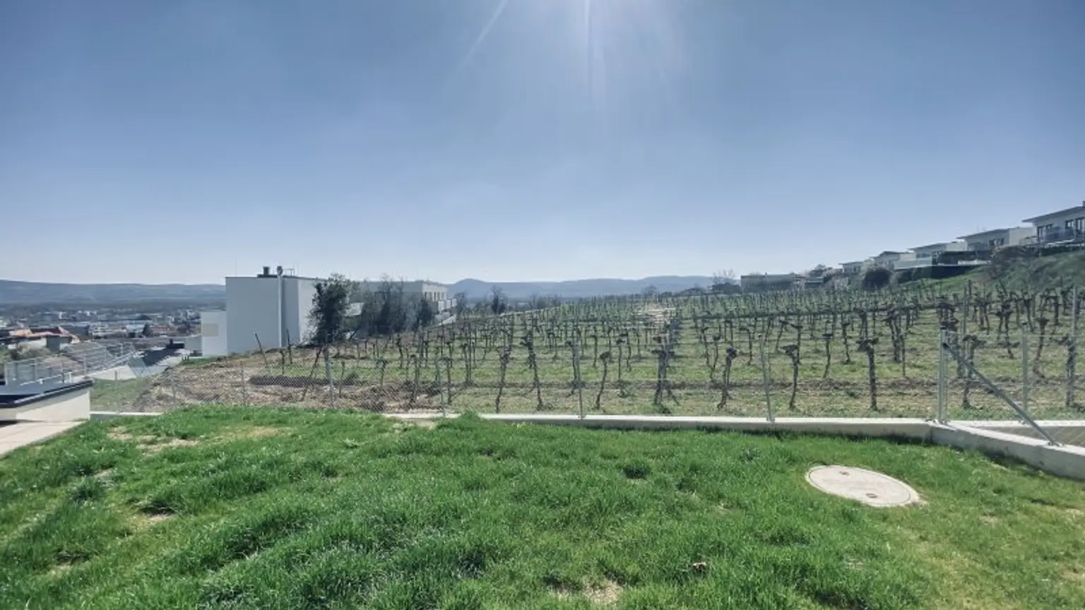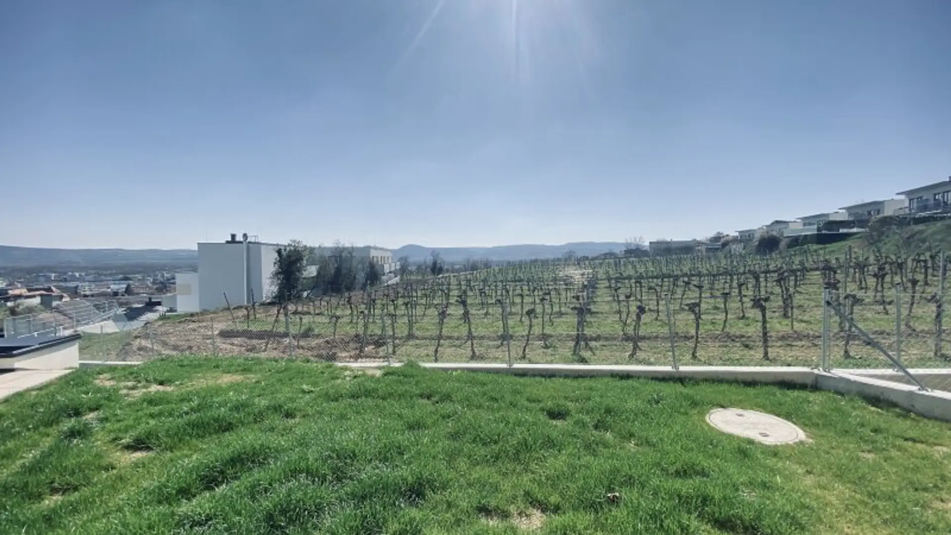 Die Wohnungen sind umgeben von Grünflächen und Weingärten.