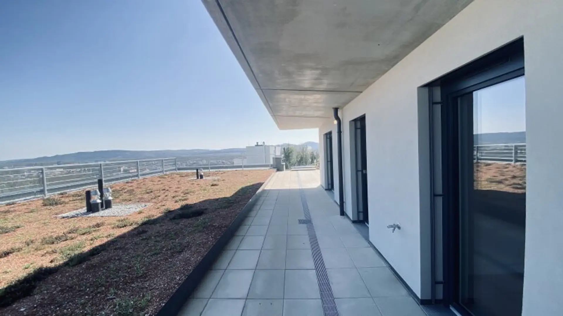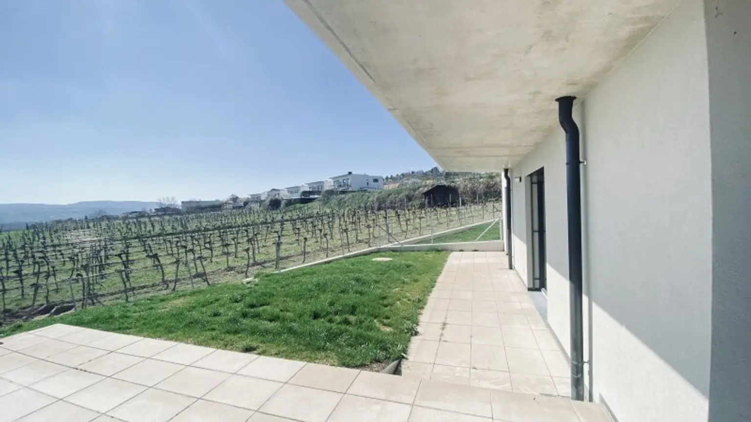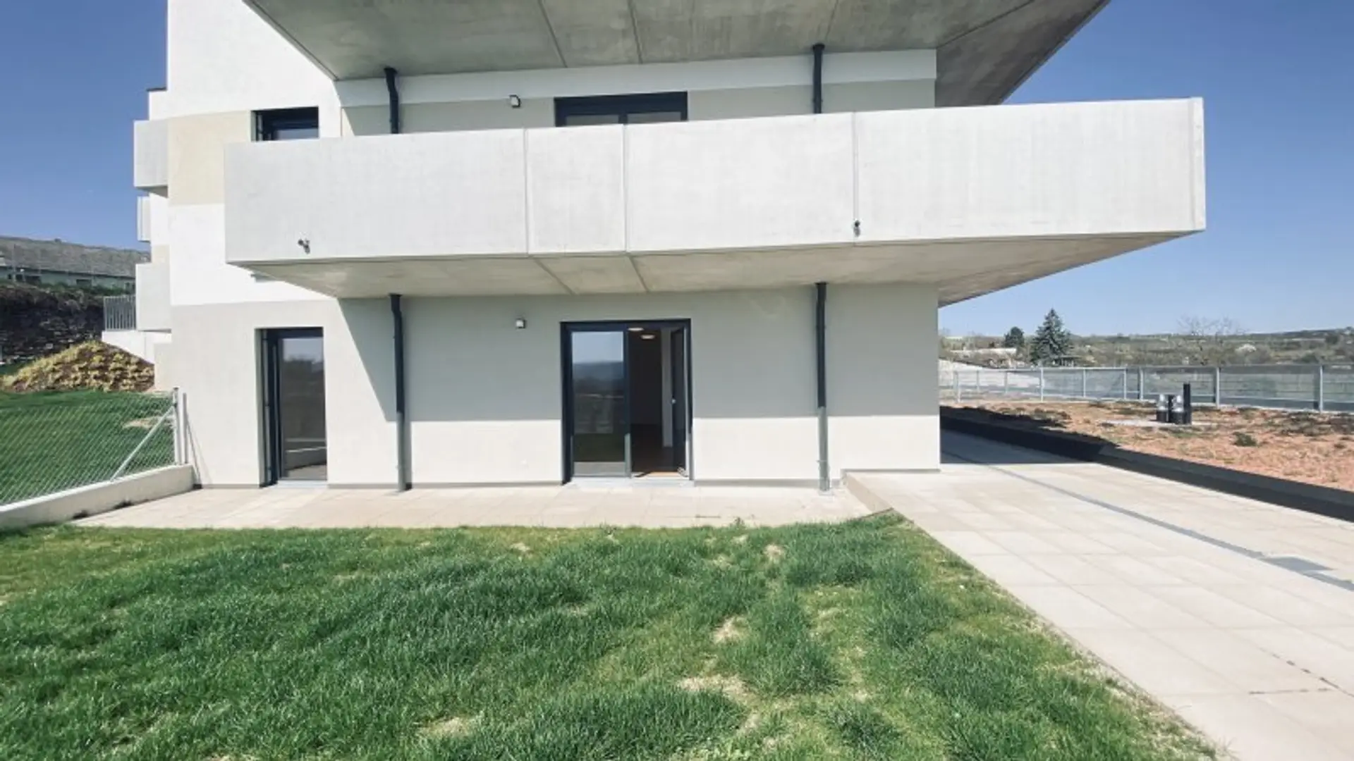 Die Wohnungen sind umgeben von Grünflächen und Weingärten.