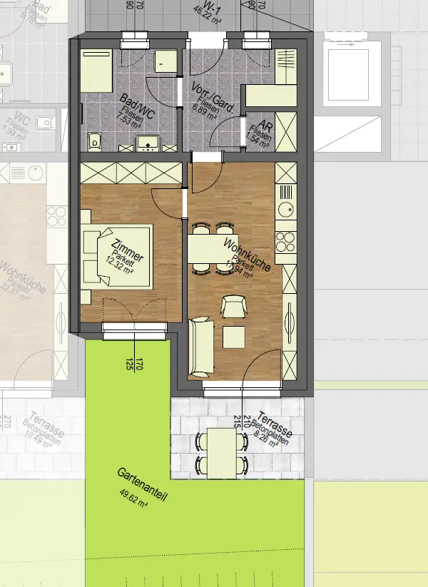 mit 46 m² Wohnfläche, 8 m² Terrasse und 49 m² Garten, Küchen-Wohn-Essbereich, Schlafzimmer, Kellerraum, Fußbodenheizung/Nahwärme, Kunststofffenster, Parkett, Fliesen, Baubeginn demnächst