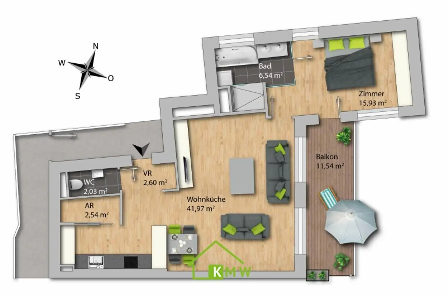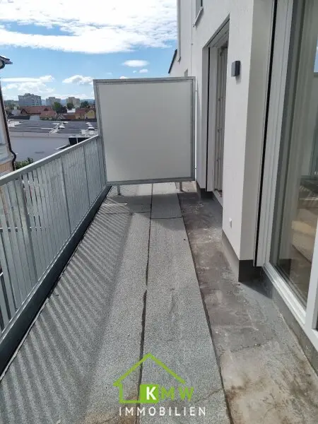 Die Wohnfläche von rund 72m² verteilt sich auf Vorraum, Abstellraum, Schlafzimmer mit integriertem Bad, separates WC, großzügige Wohnküche und Wohnzimmer mit Ausgang auf den Balkon.