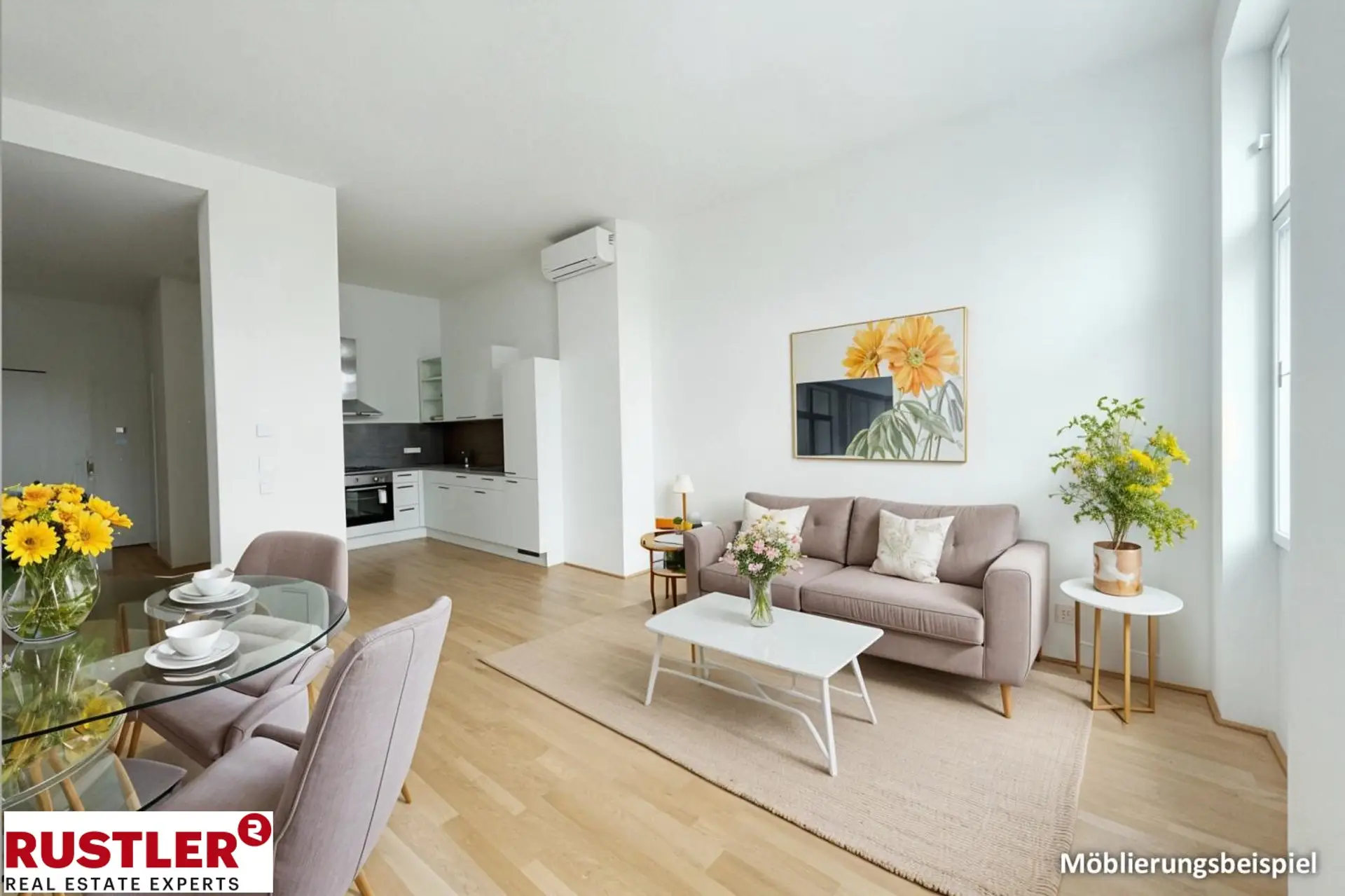Über das zentrale Stiegenhaus oder mit dem Lift (barrierefrei), gelangen Sie in diese moderne, südseitig ausgerichtete Wohnung, mit einer beeindruckenden Raumhöhe von ca. 3,10 m.