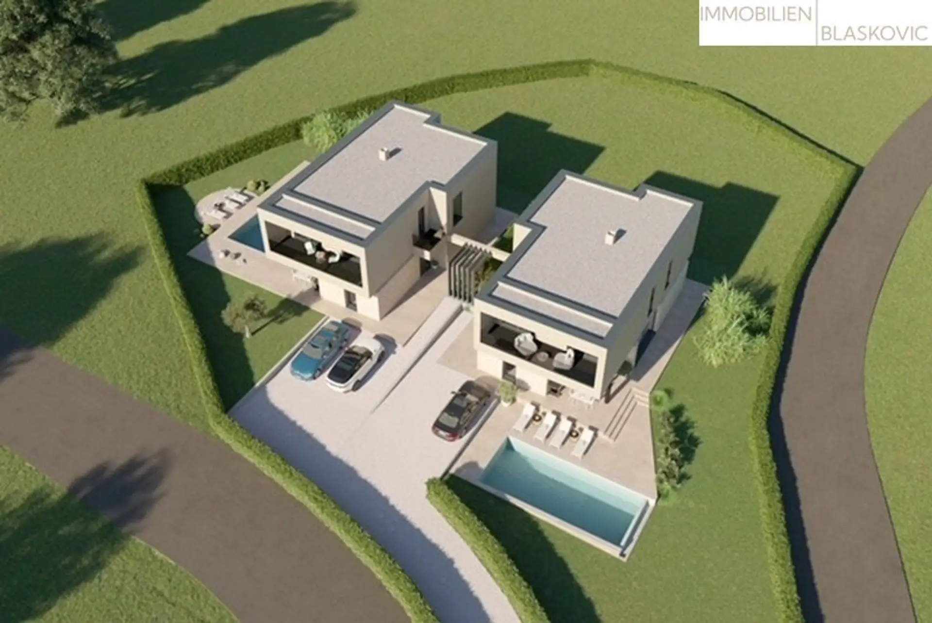 Der Investor baut zwei gleiche Villen mit Swimmingpool in ruhiger Lage, am Rande eines Dorfes, nahe dem Zentrum von Poreč (3,5 km) und wunderschönen Stränden (ca. 2 km).