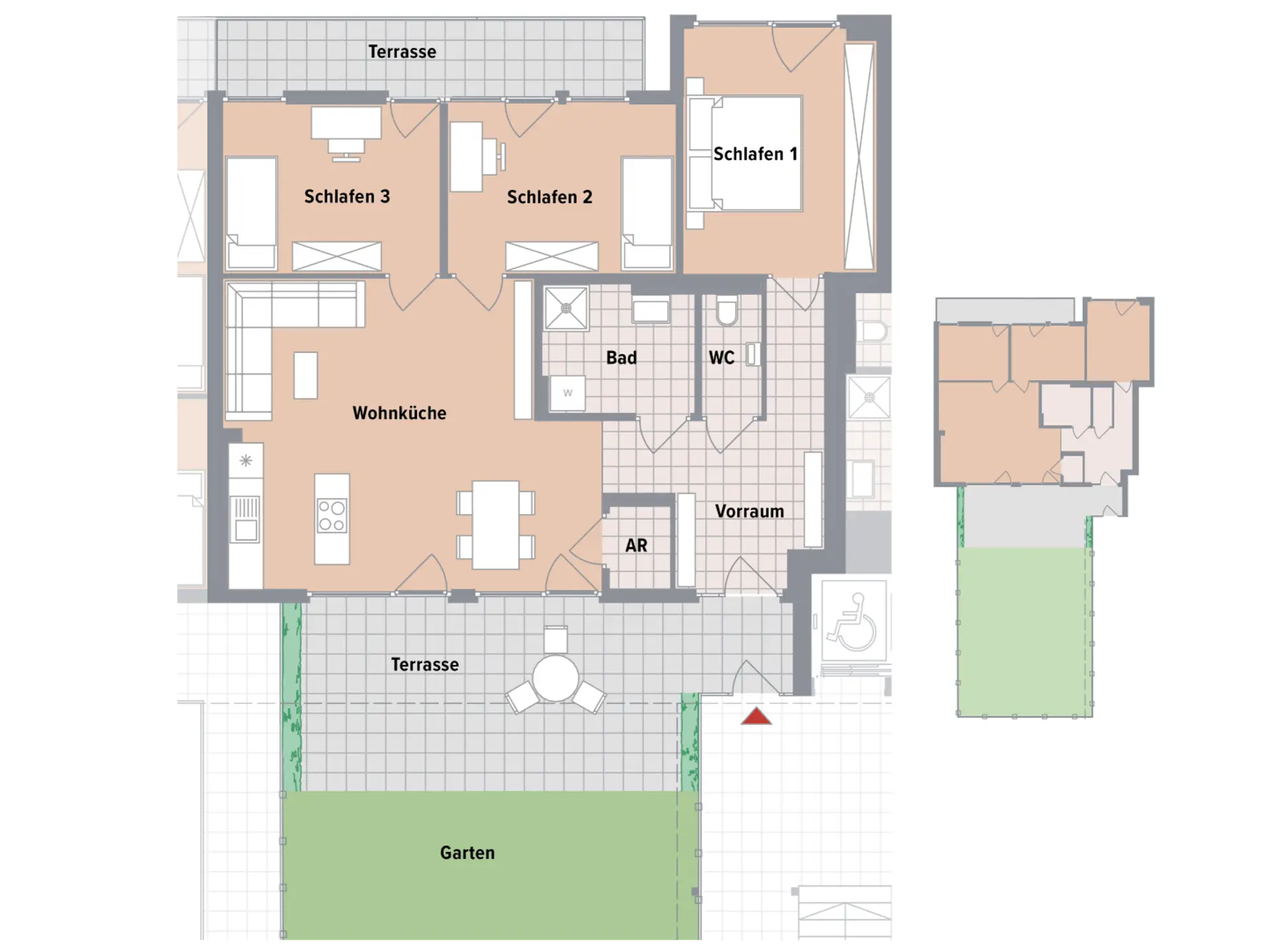 - Jede Einheit mit Balkon oder Terrasse mit Eigengarten