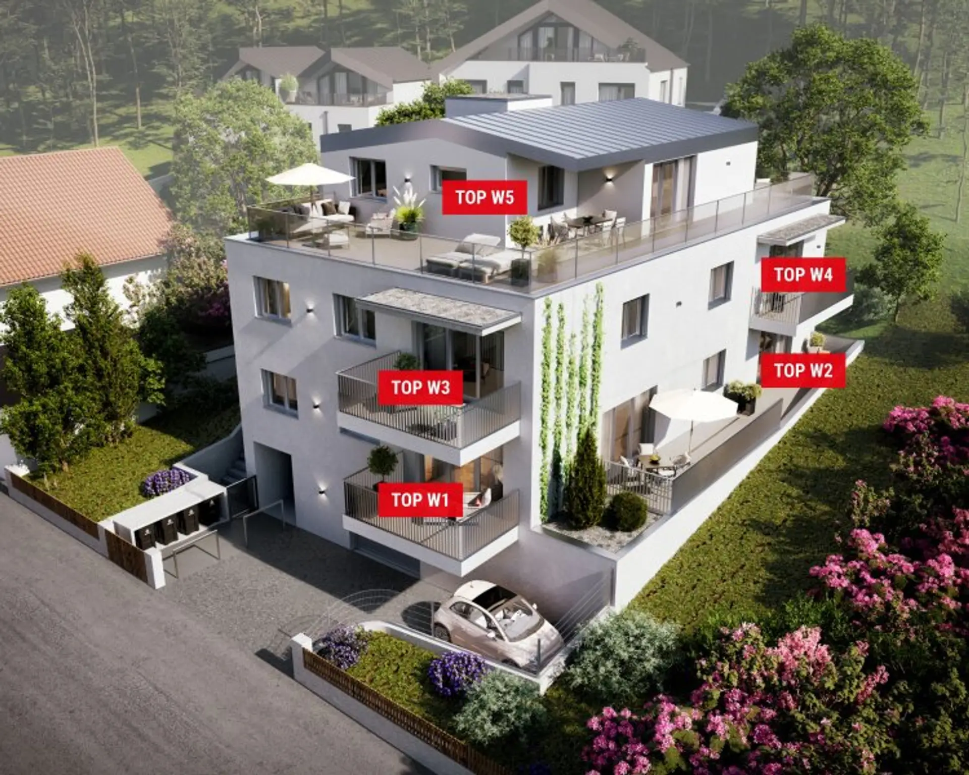 Fünf gut geschnittene, moderne 3-Zimmer-Wohnungen zwischen ca. 69 m² und 78 m², jede mit eigenem Außenbereich (Balkon, Terrasse oder Dachterrasse).