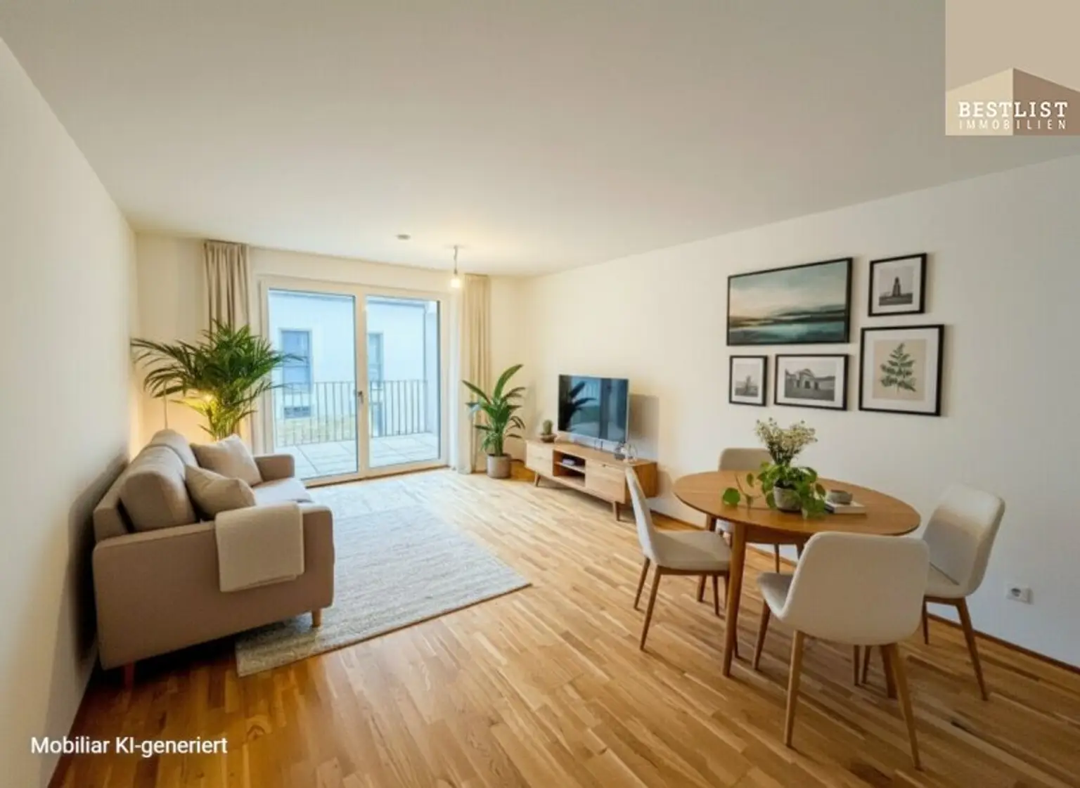 Vom praktischen Eingangsbereich aus gelangt man in das großzügige Wohnzimmer mit angrenzender Kochnische – ideal für die Einrichtung Ihrer Traumküche. Vom Wohnzimmer führt der sehr große, quadratische Balkon, ein echtes Highlight in diesem Wohnprojekt, nach außen. Dank der günstigen Außenlage, des Sichtschutzes zum Nachbarn und der rundum Begrünung genießen Sie hier ein hohes Maß an Privatsphäre und können Stunden im Freien ungestört verbringen.