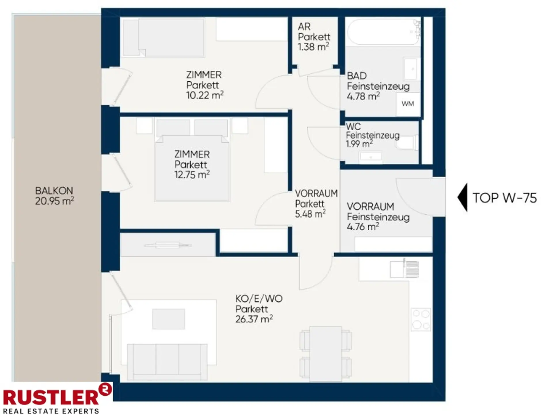 ca. 67,73m² folgende Raumaufteilung: - Vorraum - geräumige Wohnküche - 2 Schlafzimmer - Badezimmer mit Badewanne und separatem WC - großzügiger Balkon mit rd. 20m² Sämtliche Wohneinheiten verfügen über hochwertige Parkettböden und bestechen durch ihre großartige Raumaufteilung sowie den großzügigen Freiflächen. Zusätzlich dürfen sich die Mieter des Medians über eine exklusive Einbauküche samt hochwertiger Geräte freuen. Ein Kellerabteil ist dieser Wohnung zugeordnet und im Mietpreis inbegriffen.