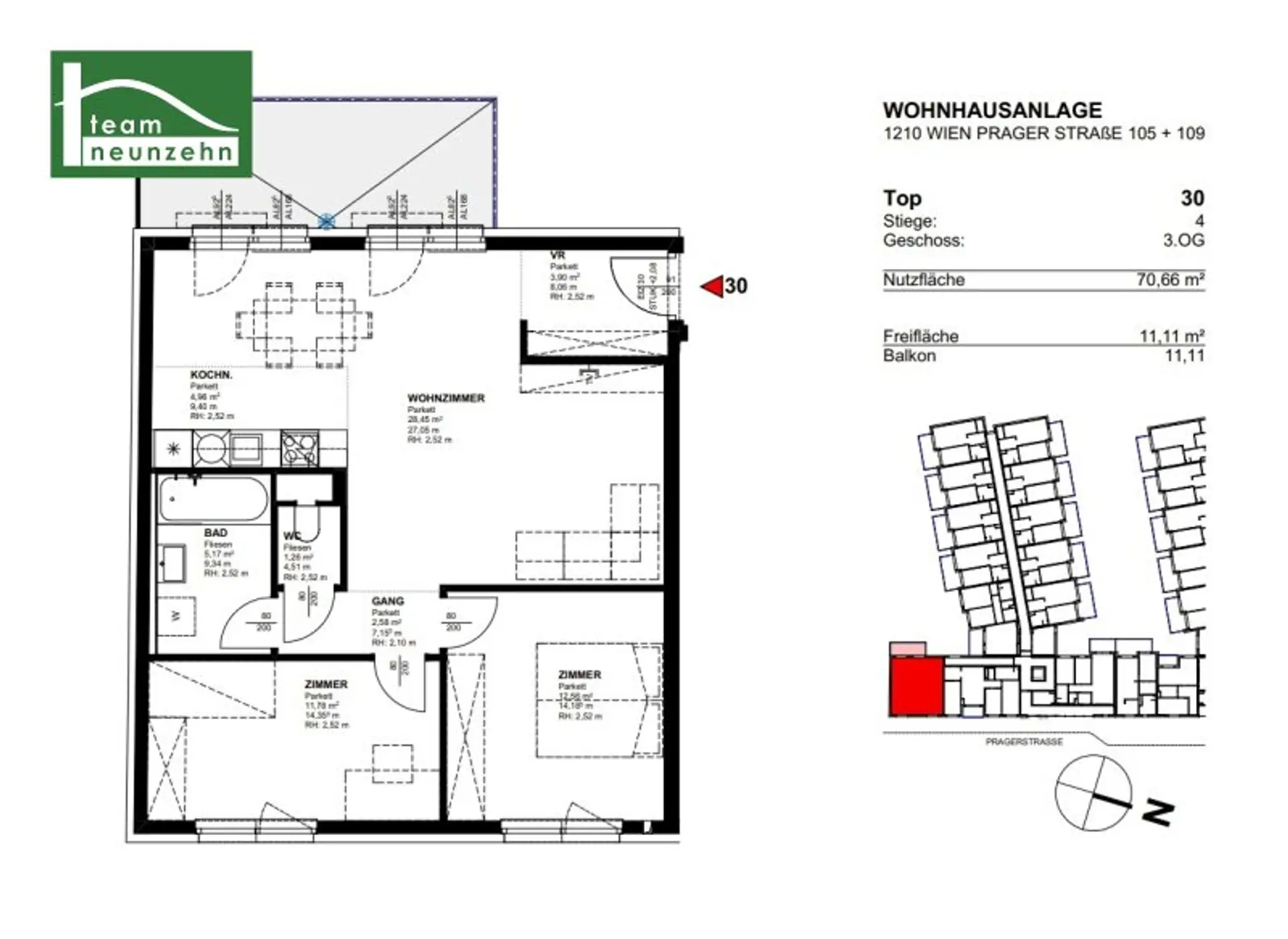 Dank der zentralen Lage an der gut frequentierten Prager Straße profitieren die Bewohner von einer ausgezeichneten Infrastruktur und umfangreichen Einkaufsmöglichkeiten. Direkt gegenüber befindet sich ein BILLA, während auch eine Apotheke, verschiedene Werkstätten und zahlreiche Restaurants schnell zu erreichen sind. Für größere Einkäufe bietet sich das Shopping Center Nord an, das nur zwei Busstationen entfernt liegt.