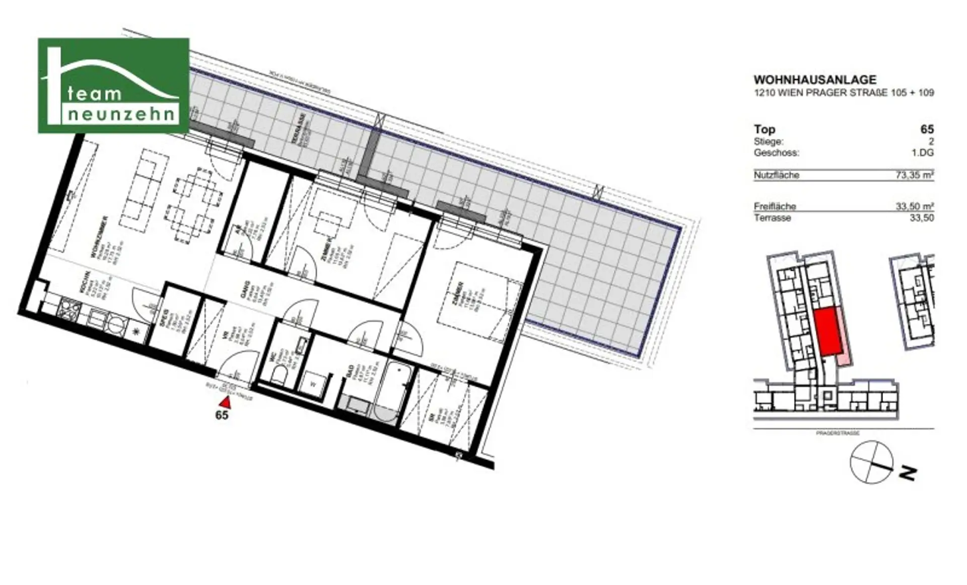 Die 3-Zimmer-Wohnung mit ca. 73,35 m² Wohnfläche sowie mit ca. 33,50 m² Terrasse befindet sich im 1. Dachgeschoss und orientiert sich Richtung Westen.