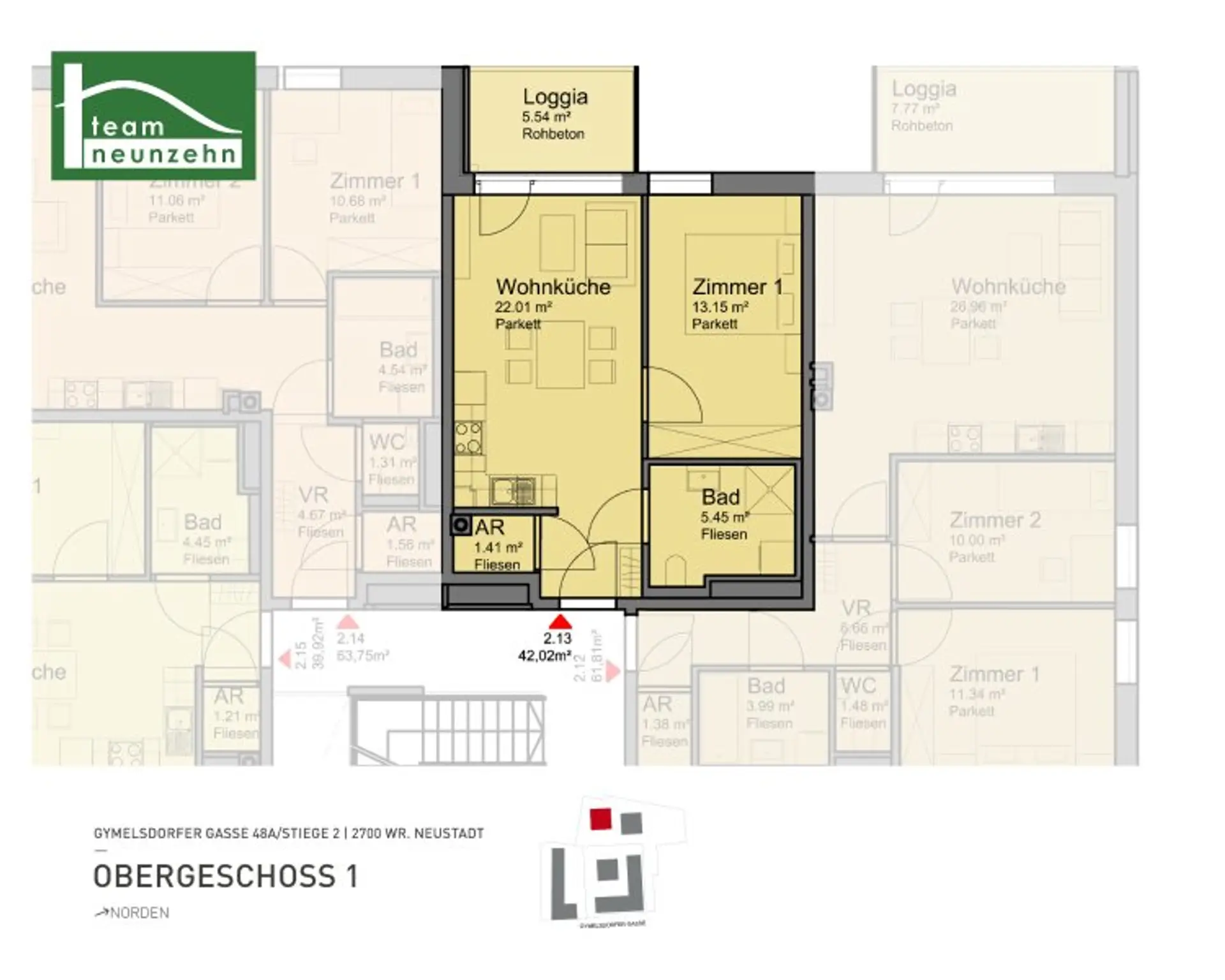 Es handelt sich hier um eine familienfreundliche und ruhige Siedlung. Die Wohnhausanlage besticht nicht nur durch die ideale Lage zum Stadtzentrum Wr. Neustadt, sondern auch durch den hohen Anspruch an Design und Architektur. So wurde eine Augenmerk auf den kompakten und gut geschnittenen Grundrissplan gelegt.