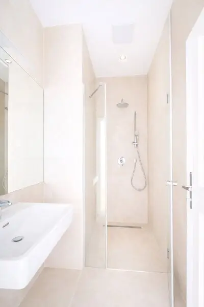 Das modern gestaltete Badezimmer ist mit einer geräumigen Dusche und eleganten Fliesen ausgestattet. Ein Highlight ist die separate Toilette, die zusätzlichen Komfort bietet.