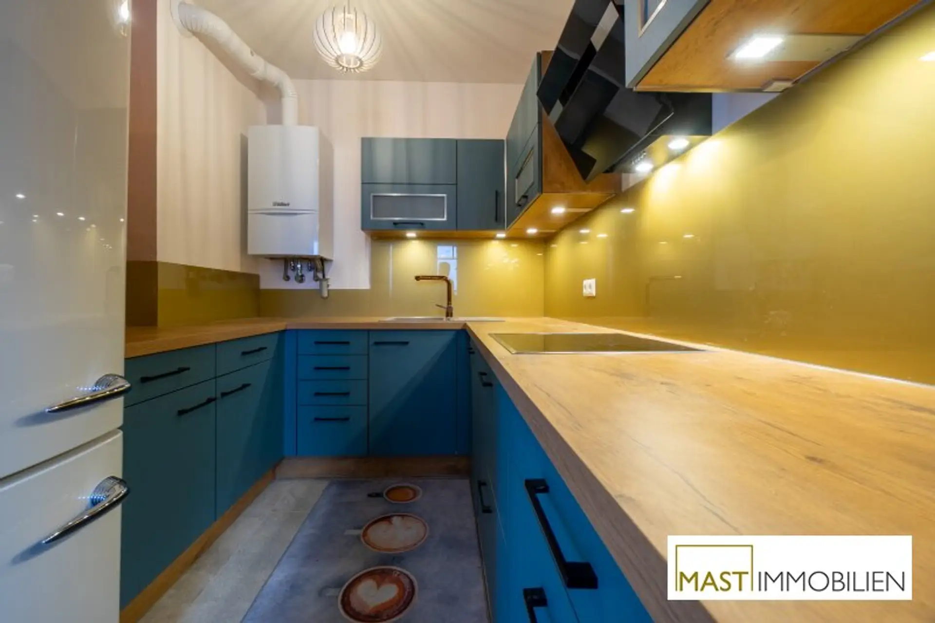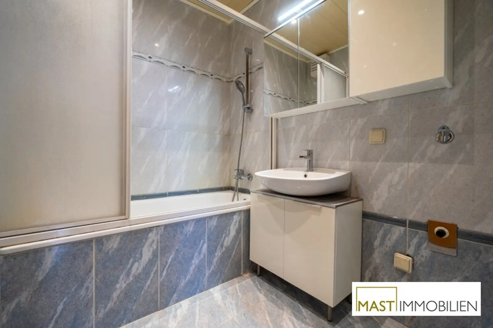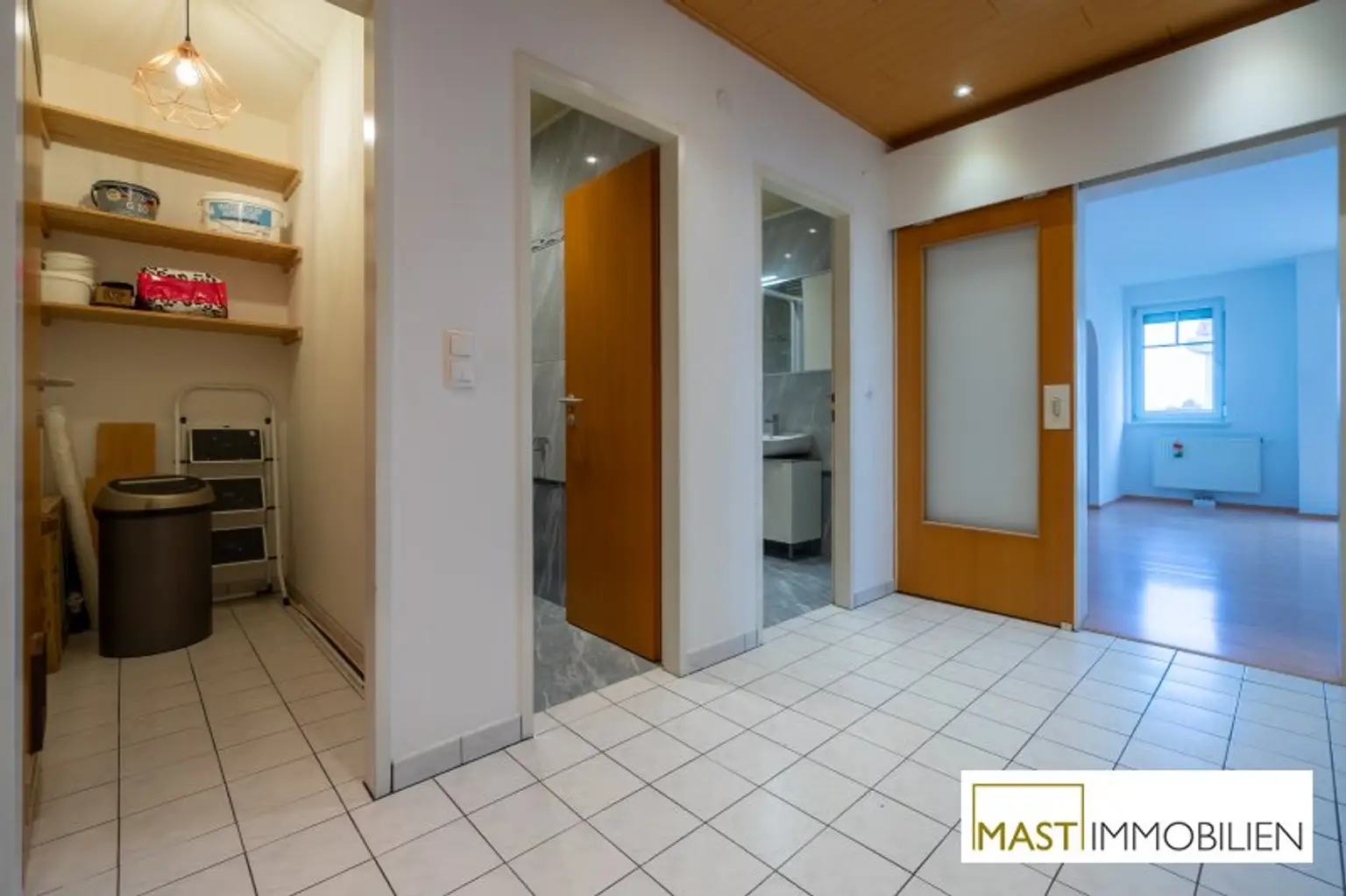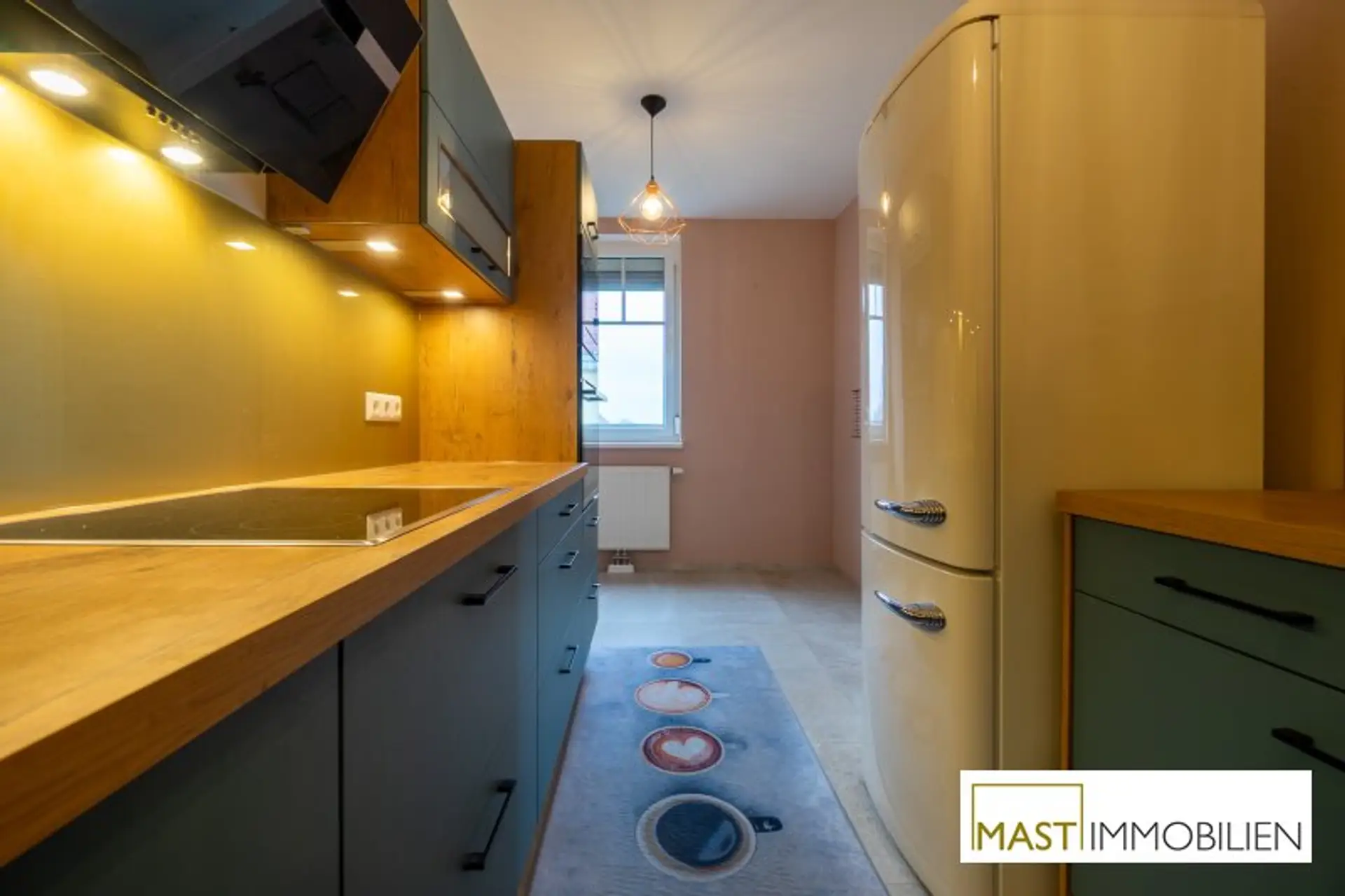 Nach Eintritt in die Wohnung gelangen Sie in ein großzügiges Vorzimmer mit ausreichend Platz für Ihre Garderobe. Das aktuelle Kinderzimmer umfasst eine Fläche von ca. 15 m² und ist direkt vom Vorzimmer aus begehbar. Das separate WC inkl. Waschbecken & Badezimmer ist ebenfalls vom Vorzimmer aus begehbar. Das optimal aufgeteilte Wohnzimmer bietet einen direkten Zugang auf die südlich ausgerichtete Freifläche (Balkon - ca. 4,50 m²). Bei einer teilweisen Sanierung der Wohnung, wurde die alte Küche gegen eine Neue inkl. "DIETER KNOLL Collection" Geräte ersetzt (Wert der Küche liegt bei ca. 20.000,-). Das Elternschlafzimmer mit einer Fläche von ca. 13,40 m² ist vom Wohnzimmer aus begehbar.