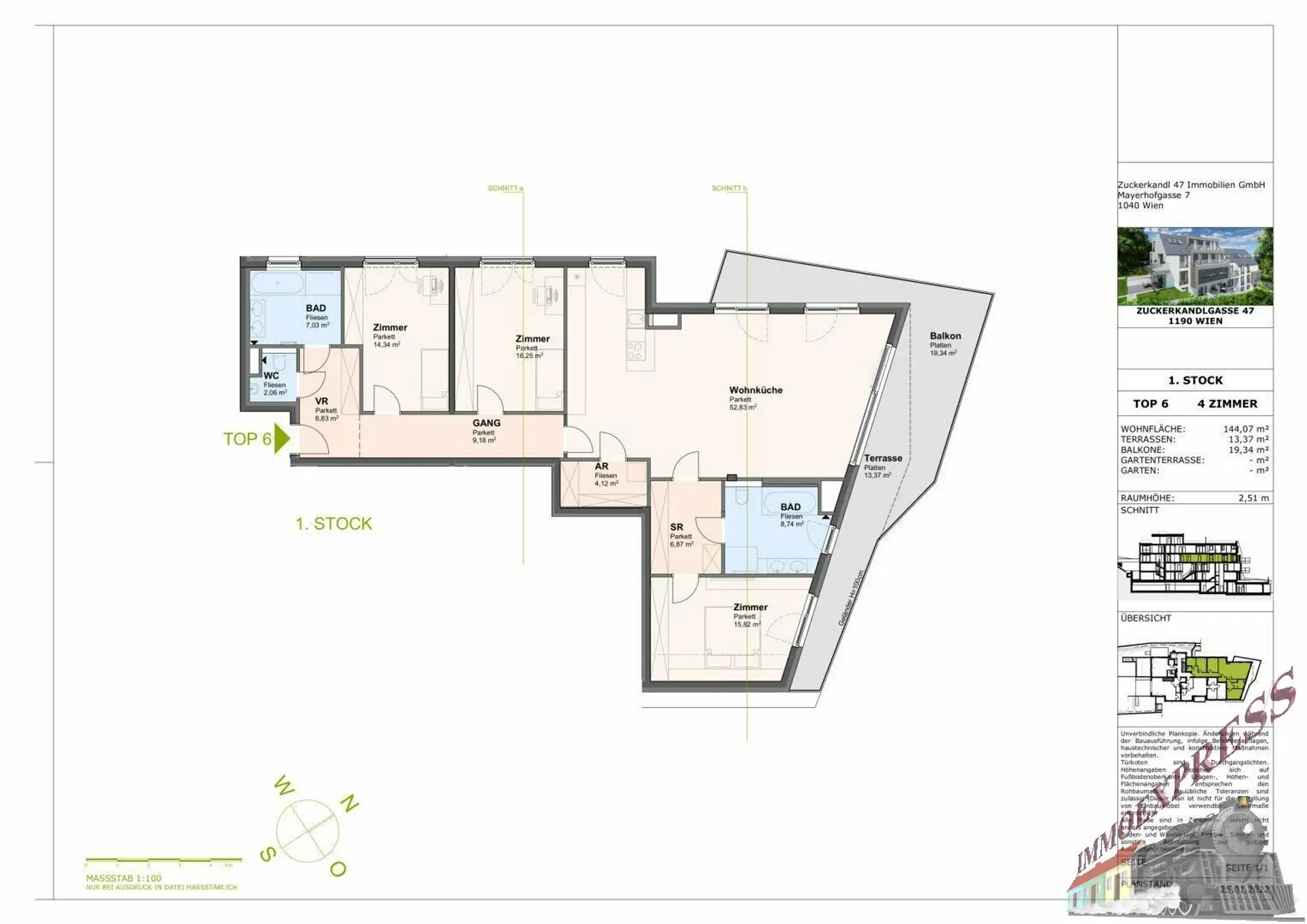 - Top 6, 1.Obergeschoss (4 Zimmer) Wohnfläche: ca. 144,07 m² + Terrasse: ca. 13,37 m² + Balkon: ca. 19,34 m²