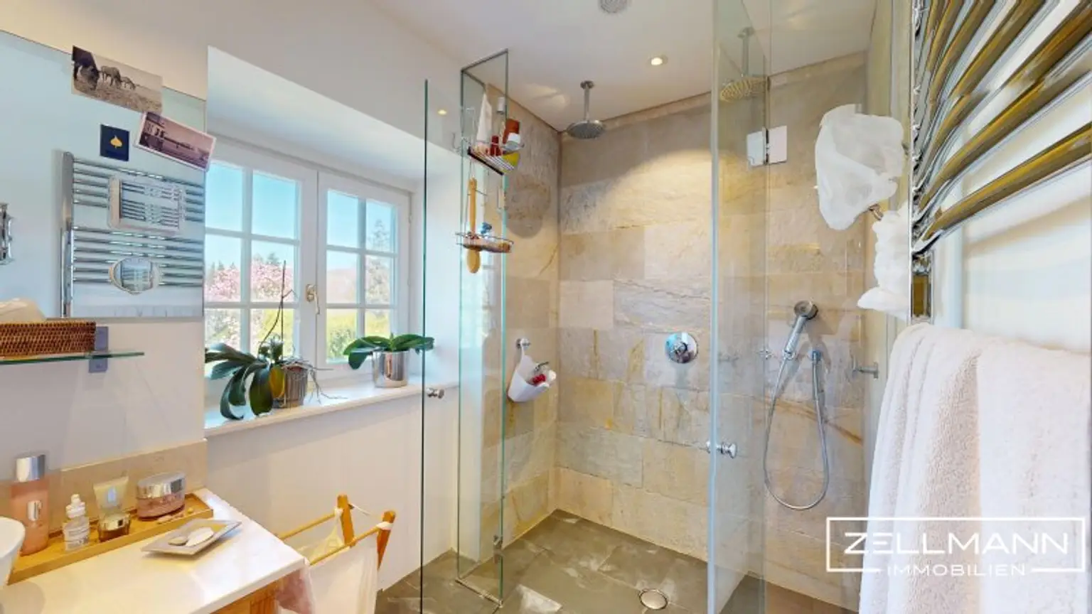 * Naturstein und hochwertige Fliesen in den Nassräumen