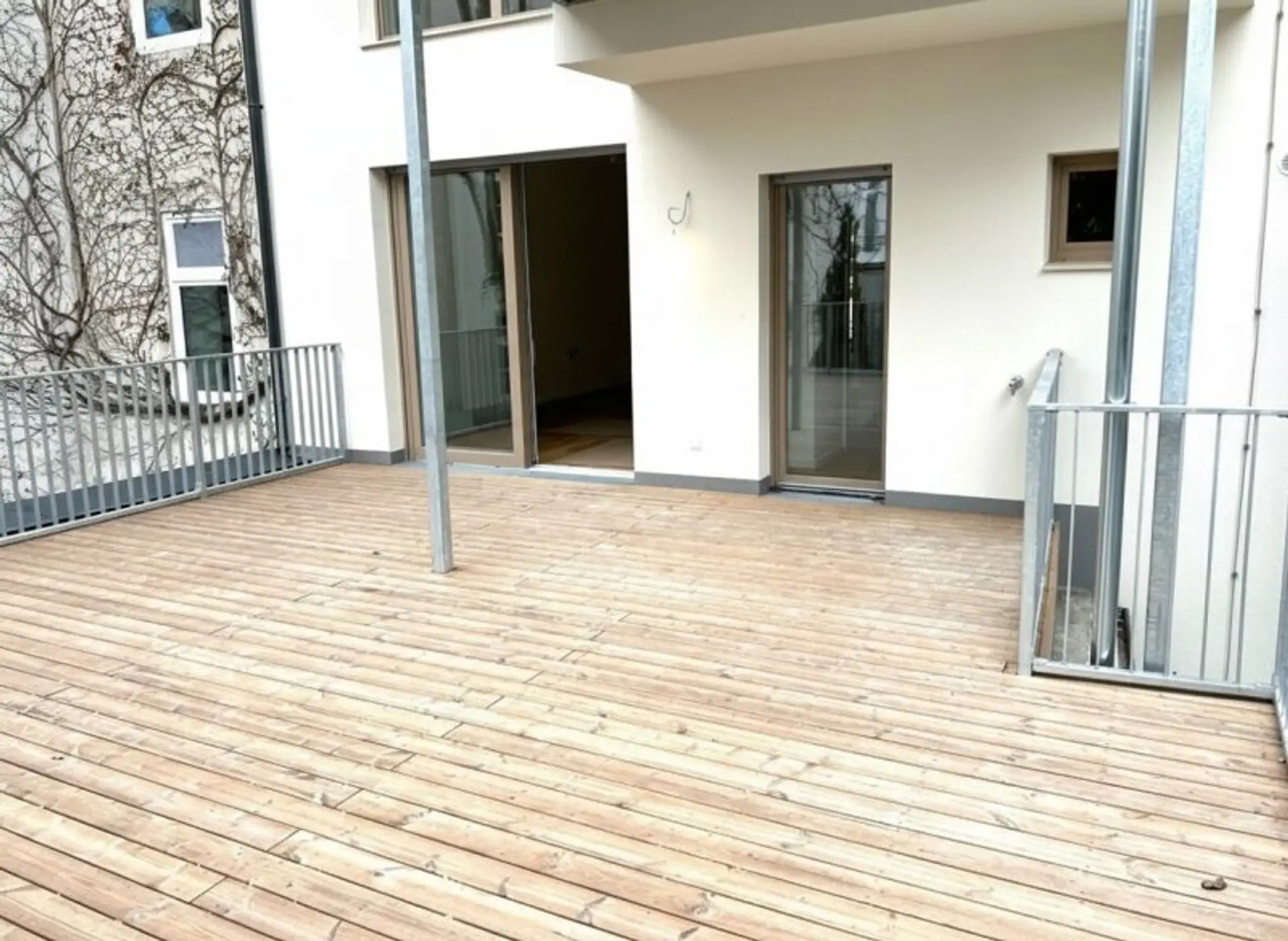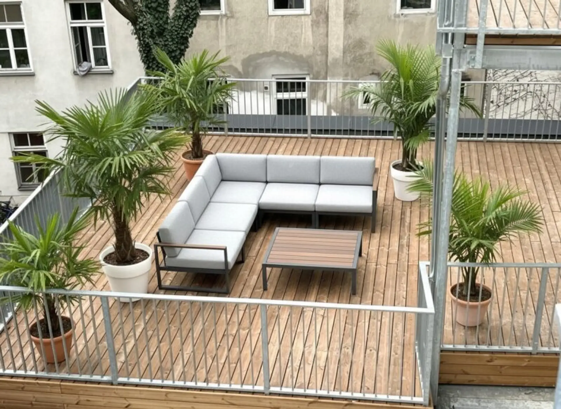 Hinweis: Zur besseren Veranschaulichung des Potenzials wurde die Terrasse virtuell eingerichtet. Die Originalaufnahmen der Terrasse sind ebenfalls beigefügt, sodass sowohl die Gestaltungsidee als auch der reale Zustand nachvollzogen werden können.