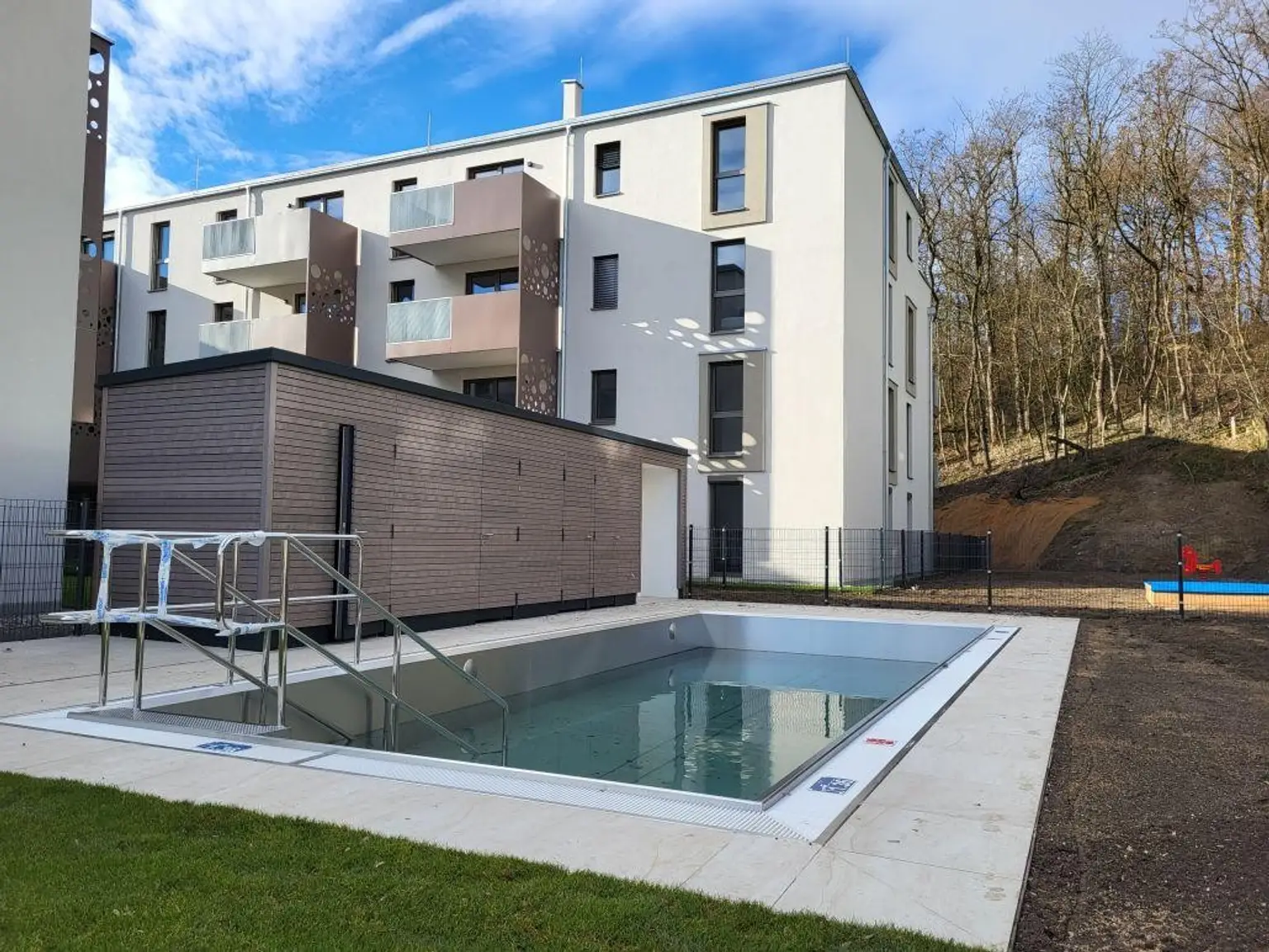 Die neue Wohnhausanlage verfügt über ein tolles Gemeinschaftsangebot mit Edelstahlpool 9x4m, einer Dachterrasse mit Grillmögklichkeit und wunderschönem Blick über die Stadt St. Pölten bis hinein ins Alpenvorland. Weiters gibt es Fahrrad- und Kinderwagenabstellplätze, ein Kellerabteil, und großzügige Grünflächen mit Kinderspielplatz.