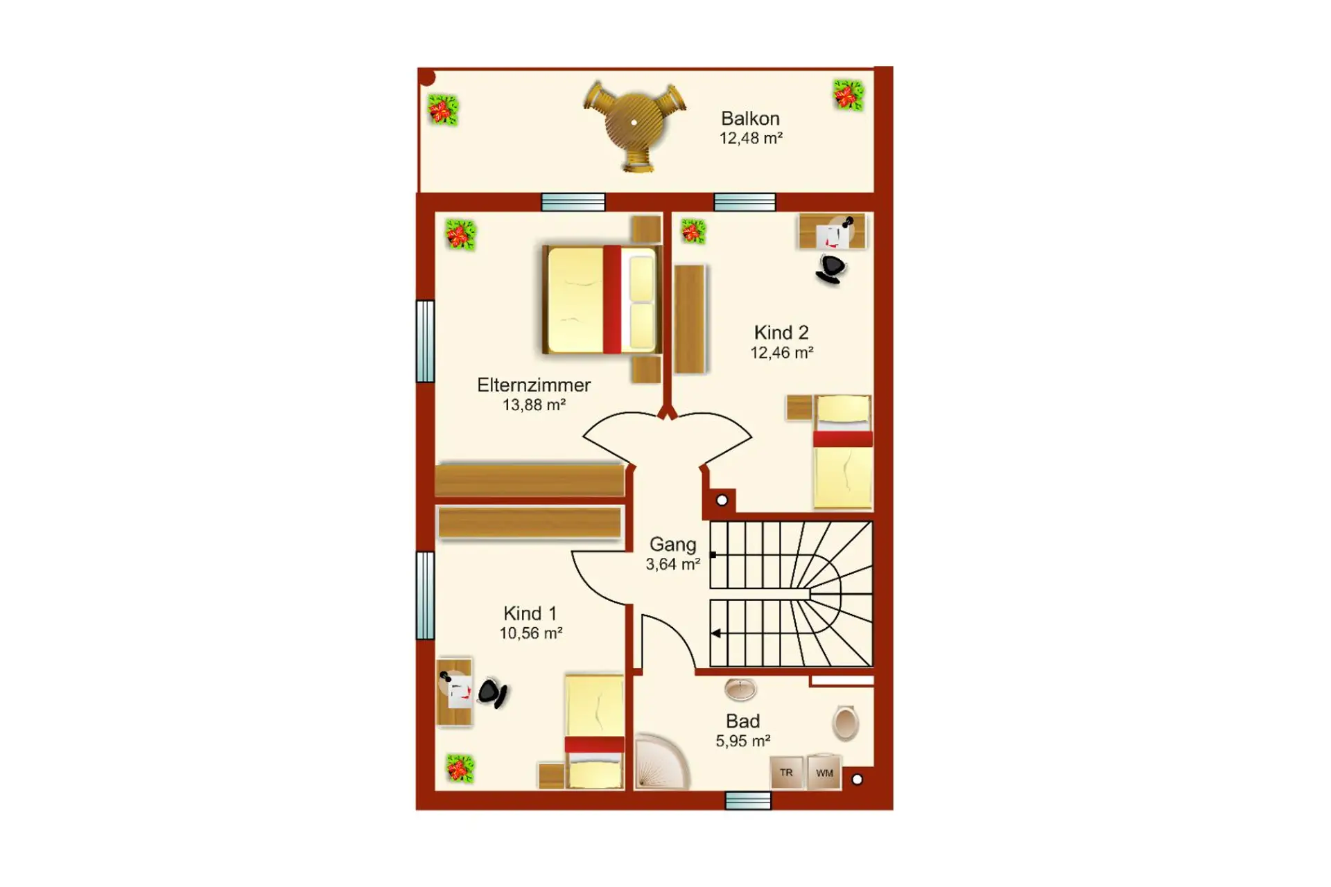 Das Obergeschoss umfasst drei getrennte Zimmer, einen Balkon sowie ein Badezimmer mit Eckbadewanne und WC.