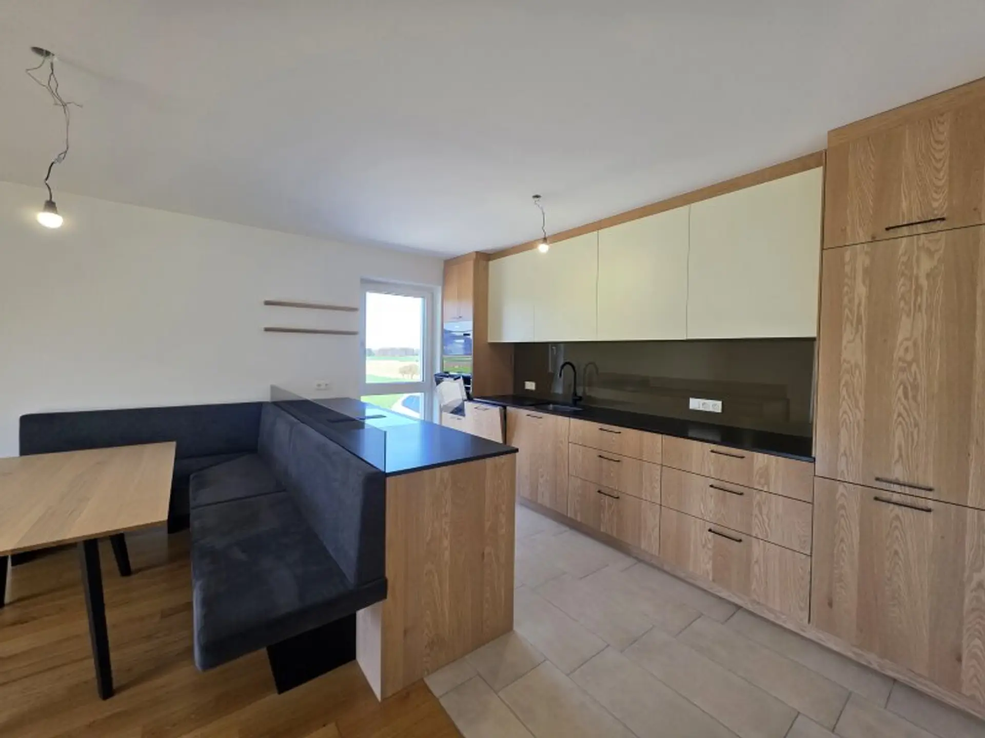 Ein großzügiger, möblierter Vorraum bietet reichlich Platz für Garderobe und Aufbewahrung. Moderne Annehmlichkeiten wie Fußbodenheizung, elektrische Raffstores und Fliegengitter erhöhen den Wohnkomfort zusätzlich. Zwei PKW-Stellplätze direkt vor der Haustür sorgen für bequeme Parkmöglichkeiten. Der schöne Fernblick auf die umliegende Bergwelt und ins Grüne schafft eine entspannende Atmosphäre.
