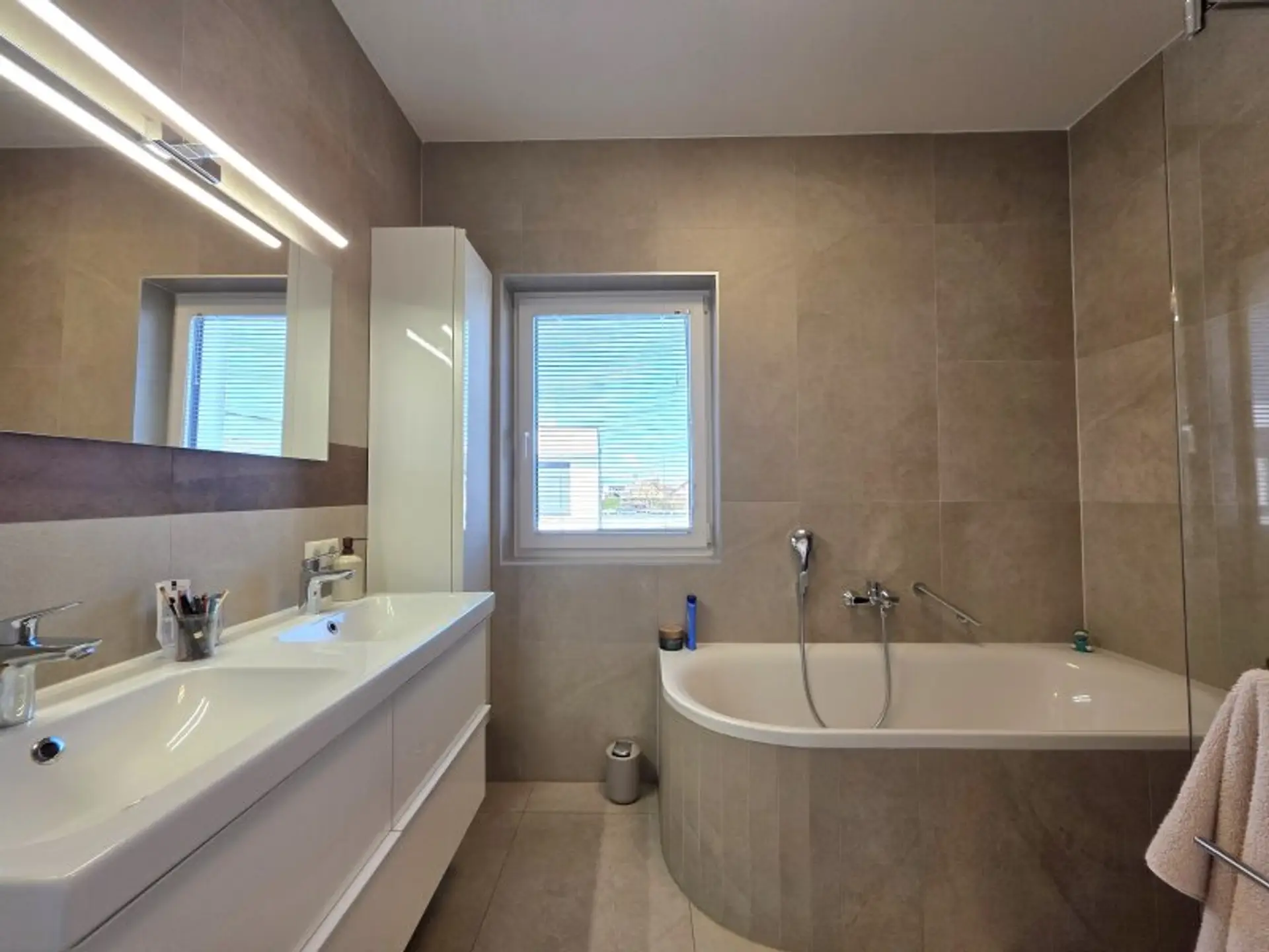 Das Badezimmer überzeugt mit Fenster, Dusche, Badewanne und modernen Sanitäreinrichtungen. Die Toilette ist separat vom Vorraum begehbar, und ein praktischer Abstellraum steht ebenfalls zur Verfügung.