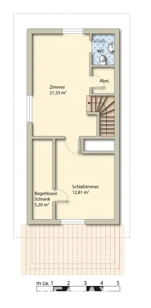 Im Obergeschoss befinden sich Schlafzimmer mit einem praktischen begehbaren Schrank und ein großes Wohn- und Arbeitszimmer mit Zugang zu einem zweiten WC und einem weiteren Abstellraum.