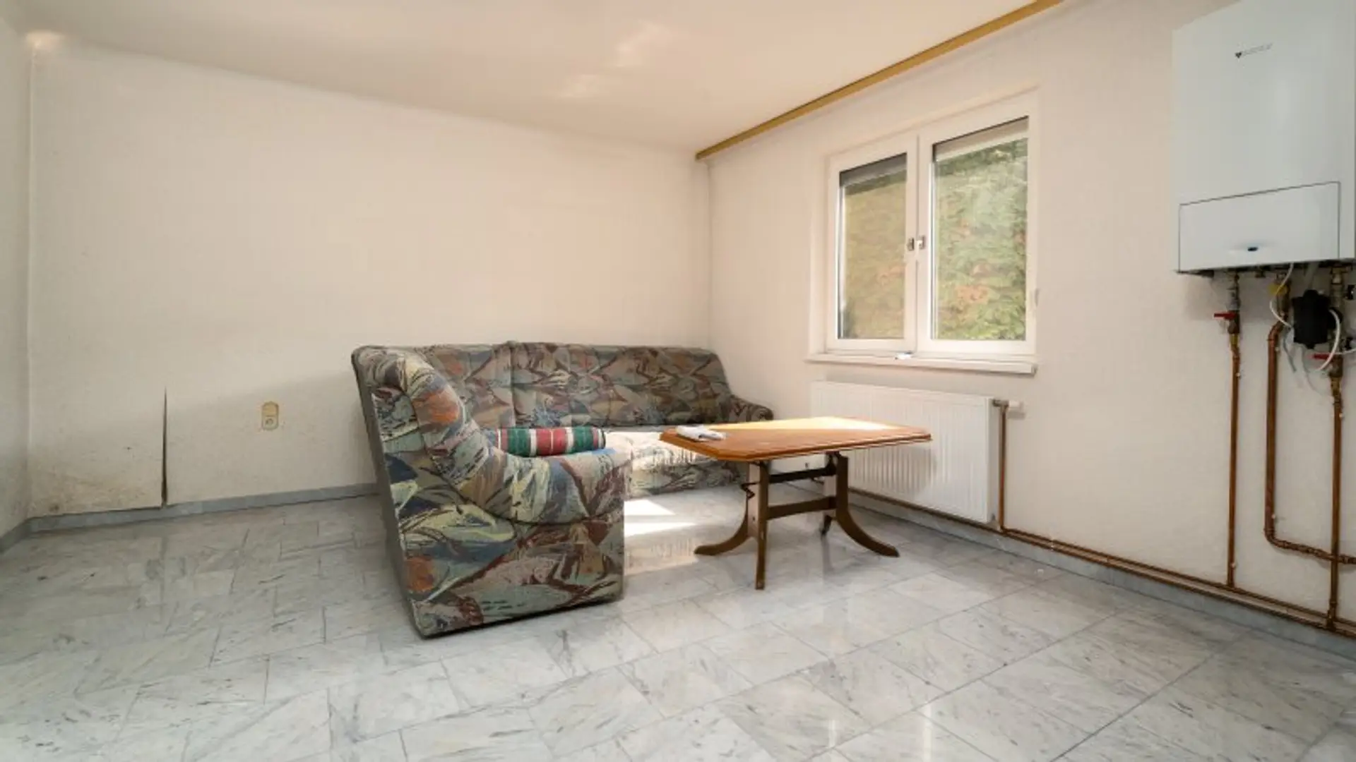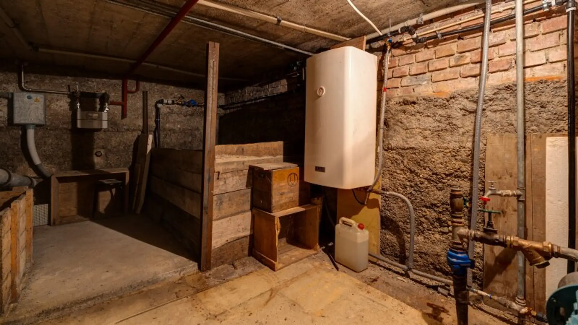 Ein kleiner Kellerraum dient als Technikbereich und beherbergt den Wasseranschluss, den Gasanschluss, den Warmwasserboiler sowie die Brunnenpumpe.
