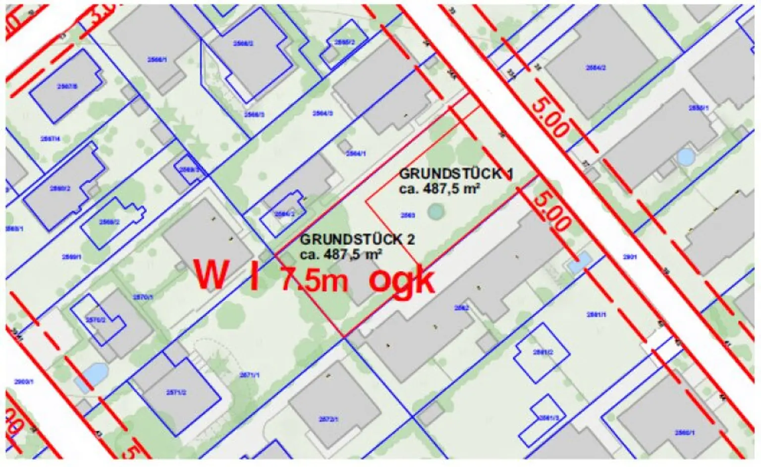 Nordost - Südwest ausgerichteter Baugrund, der aktuell noch aus einem großen Grundstück besteht und in weiterer Folge vermutlich in 2x 488m² große Teilstücke getrennt wird.