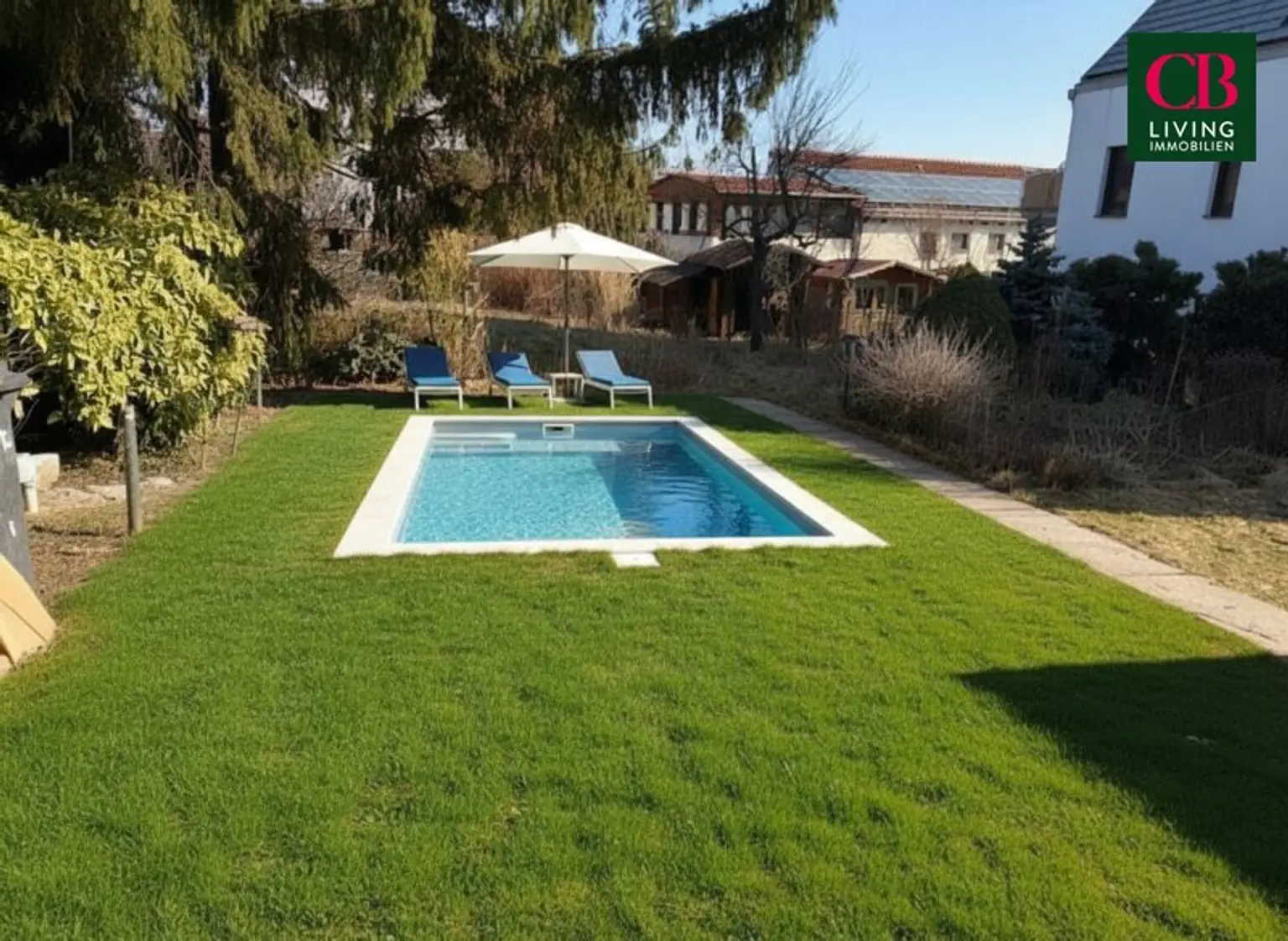Der knapp 800 m² große, fast ebene, liebevoll angelegte Garten bietet auch Platz für ein Pool mit traumhafter Aussicht.