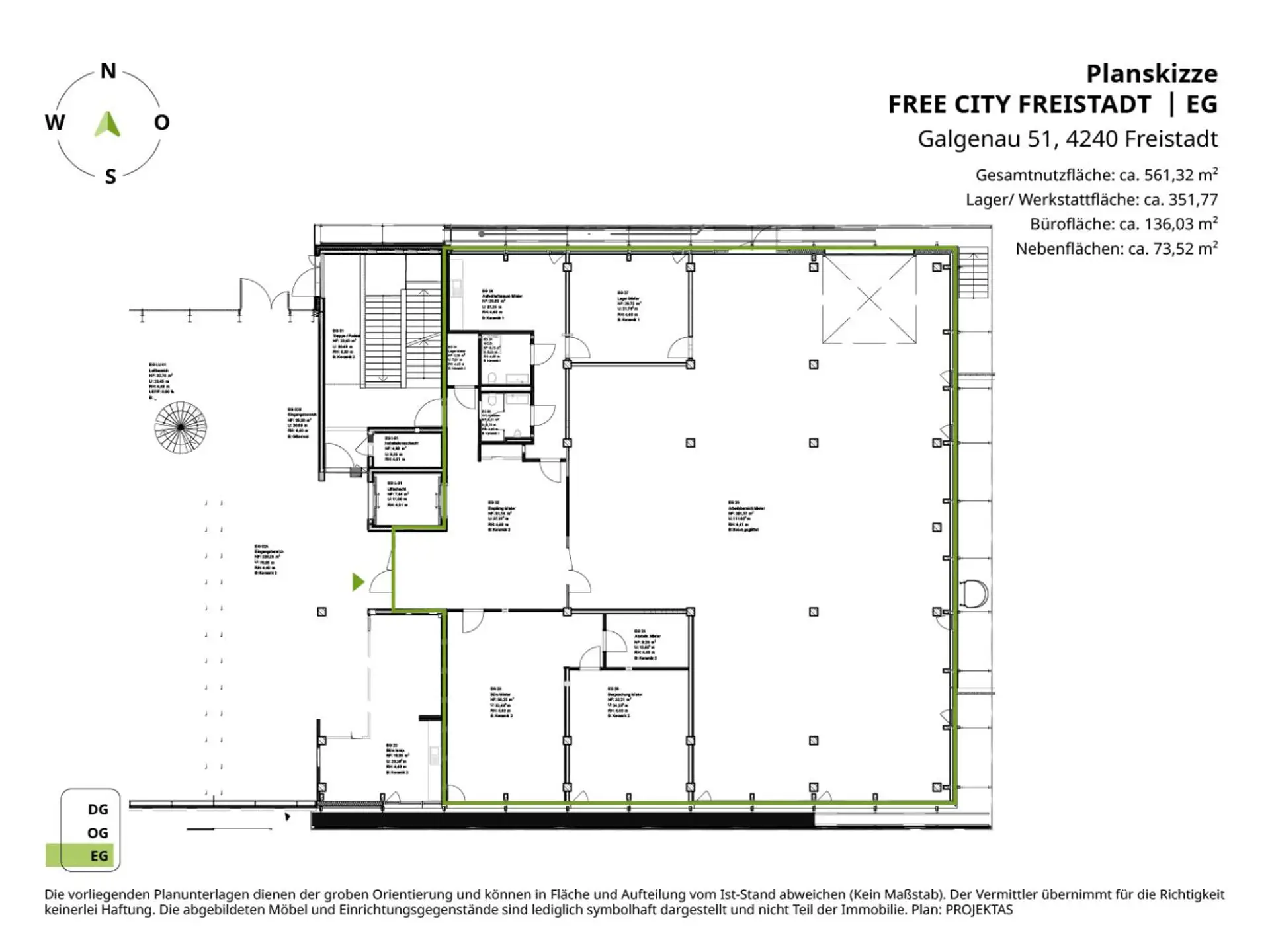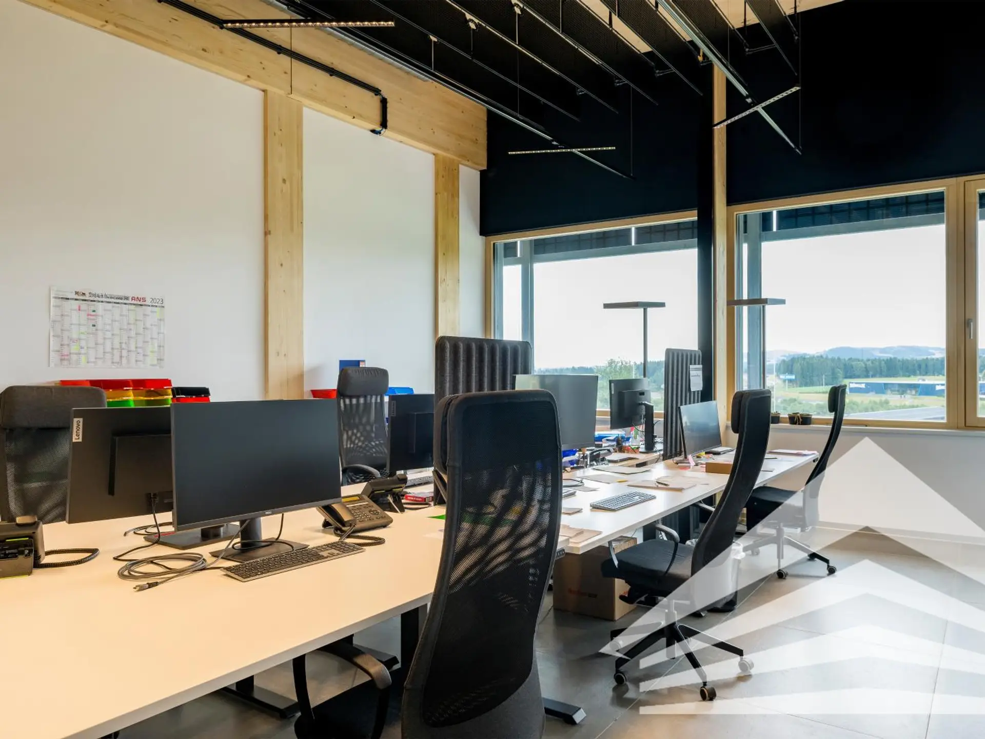 Südöstlich befindet sich ein 50 m² großes Büro mit angeschlossenem Besprechungsraum mit ca. 32 m².
