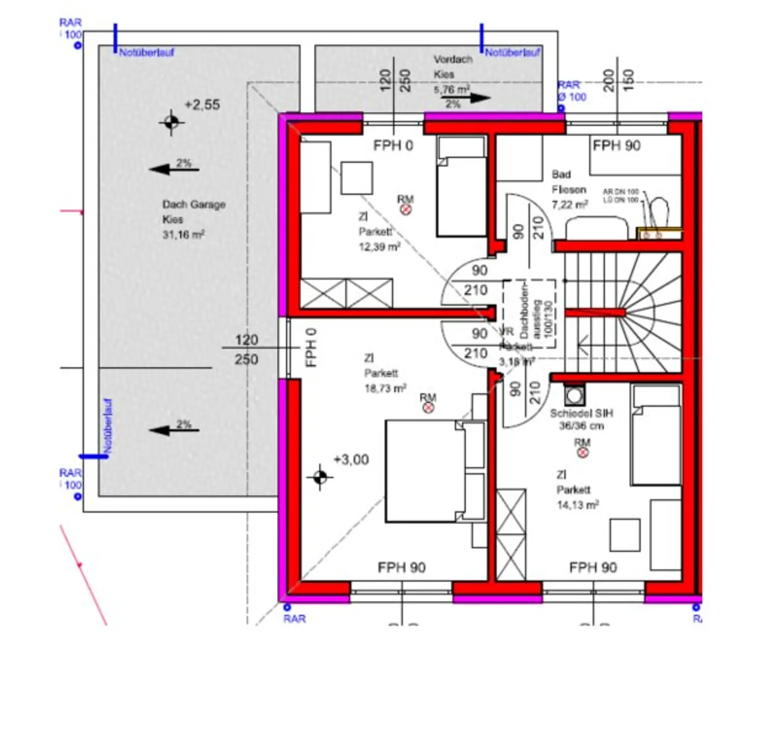 Das Obergeschoß besticht durch 3 Zimmer (Schlafzimmer, Kinderzimmer, Büro, Gästezimmer,...), einen Bad mit WC, Dusche und Badewanne. Weiters befindet sich im Vorraum ein Aufgang zum Dachboden der für weiteren Stauraum sorgt (z.B. Weihnachtsdeko,......).
