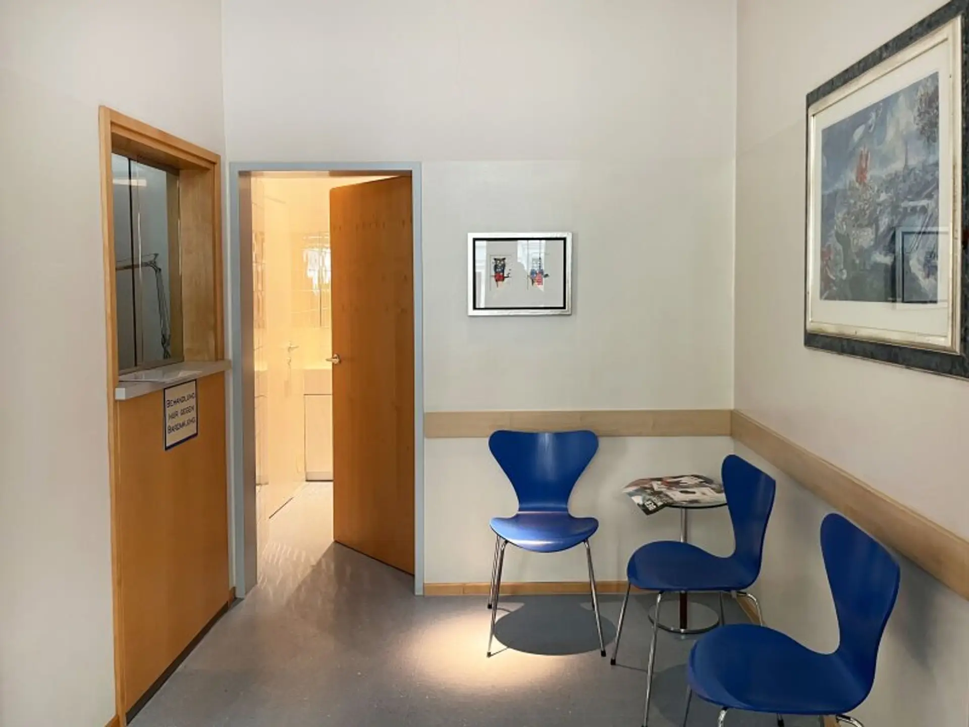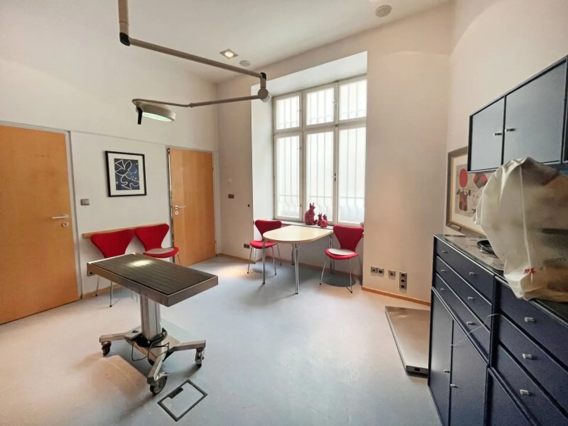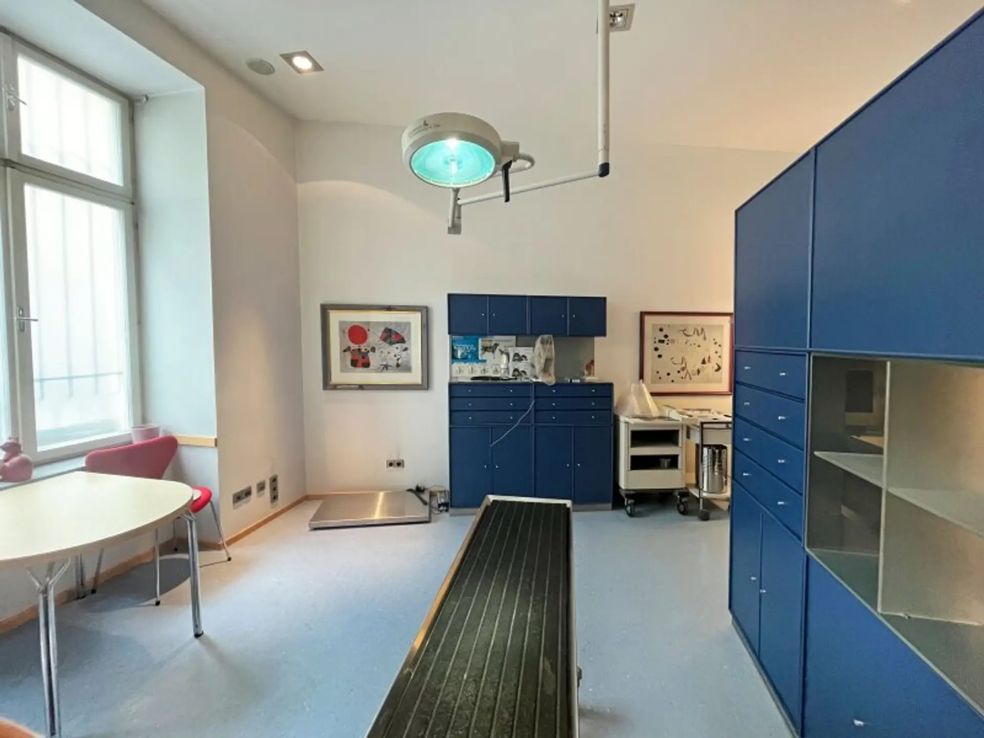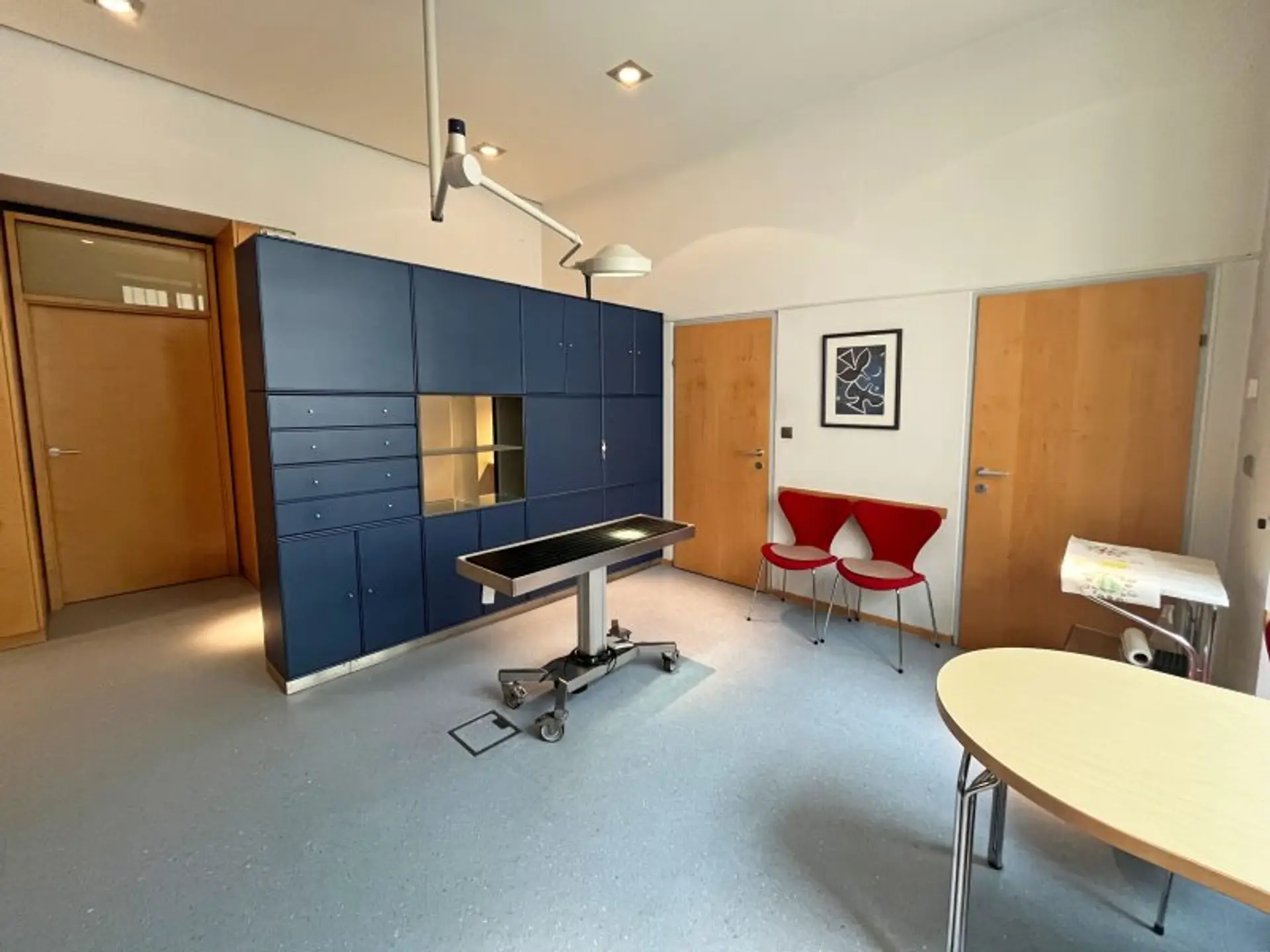 Die hochwertig ausgestattete Praxis mit Vorraum, Warteraum, Ordinationszimmer mit Waschbecken, Labor, Zahnbehandlungsraum, Röntgenraum, Wirtschaftsraum, Dusche und zwei WC's bietet über 69 m² Nutzfläche. Der Empfangsschalter befindet sich zwischen Büro und Warteraum. Für Kunden steht ein WC mit Waschtisch zur Verfügung, weiters gibt es ein WC und eine Dusche für Angestellte der Ordination. Den Personaleingang erreicht man über den Haupteingang des Wohnhauses. Gestaltet und Geplant wurde die Ordination vom Architekten Dipl. Ing. Hans Scheicher. Sämtliches Mobiliar, Innentüren und die straßenseitige Ausgangstüre stammen ebenfalls aus dem Einrichtungshaus Scheicher. Die blauen Kästen sind Designermöbel der dänischen Möbelfirma Montana.