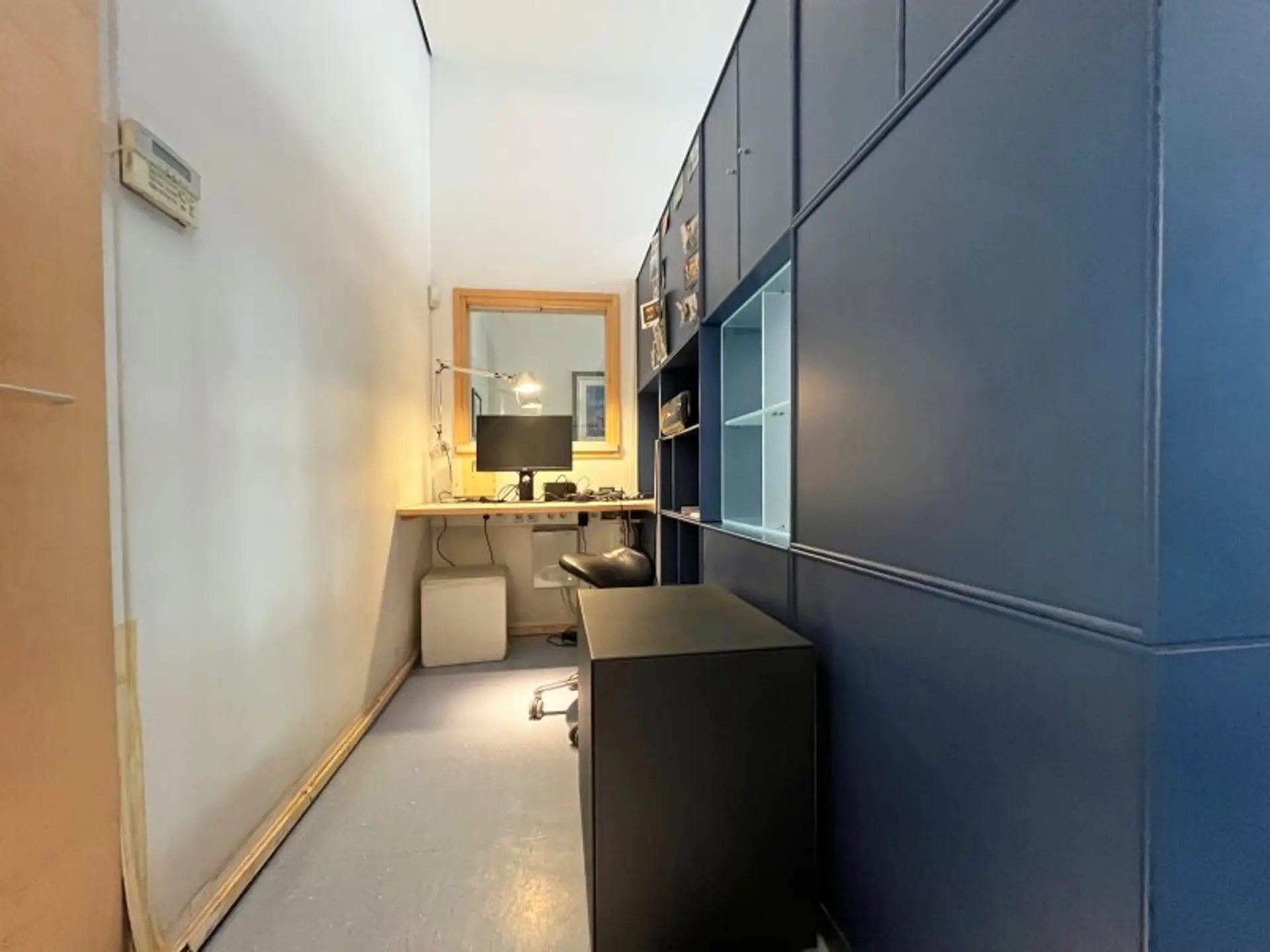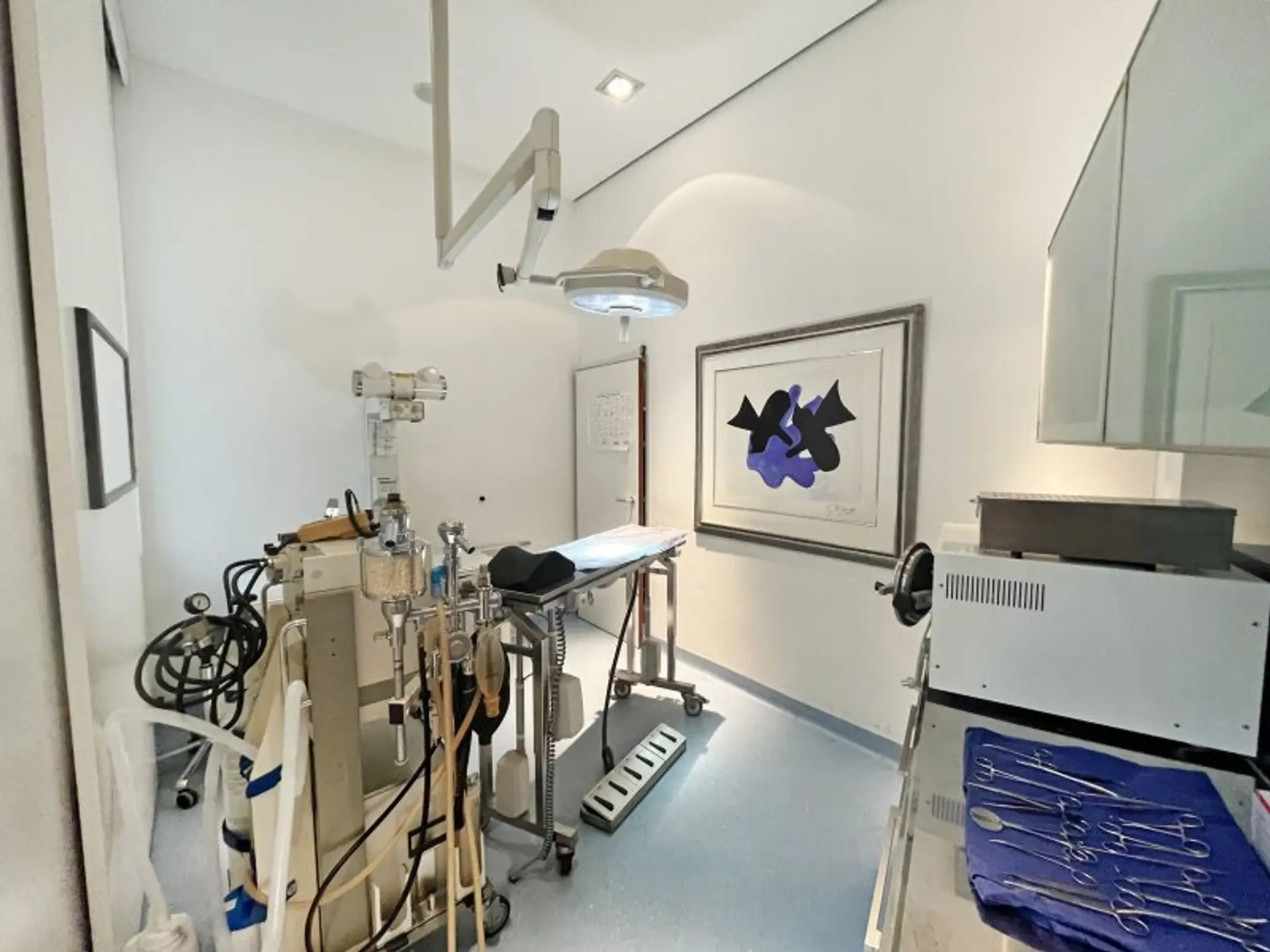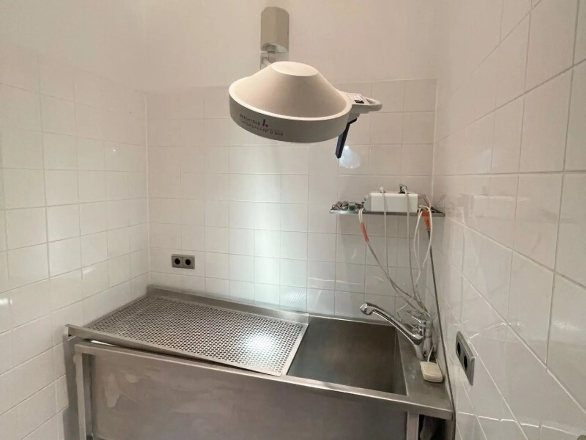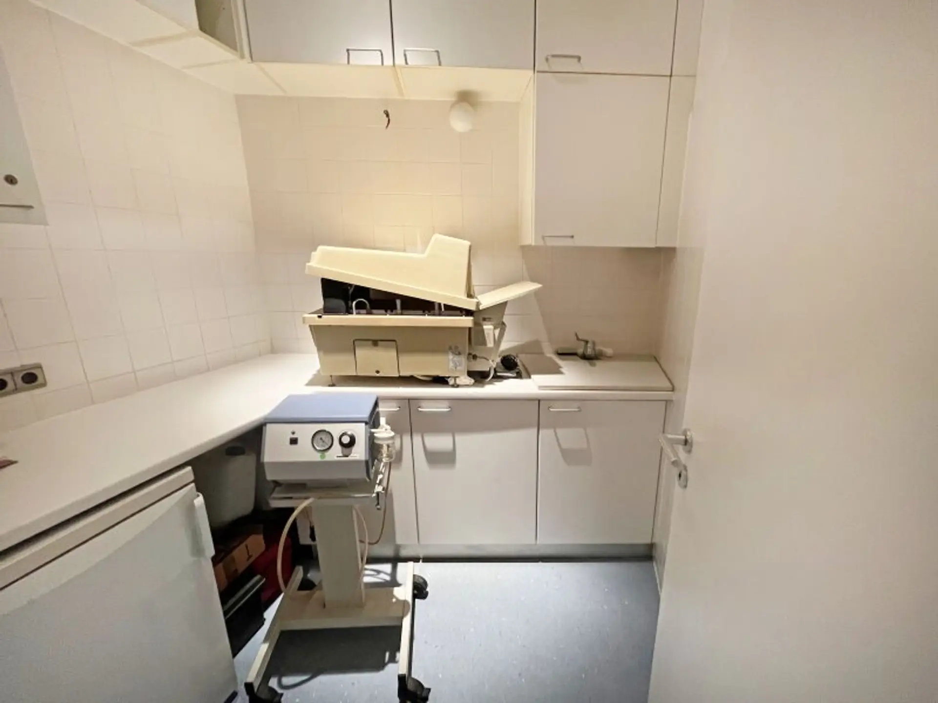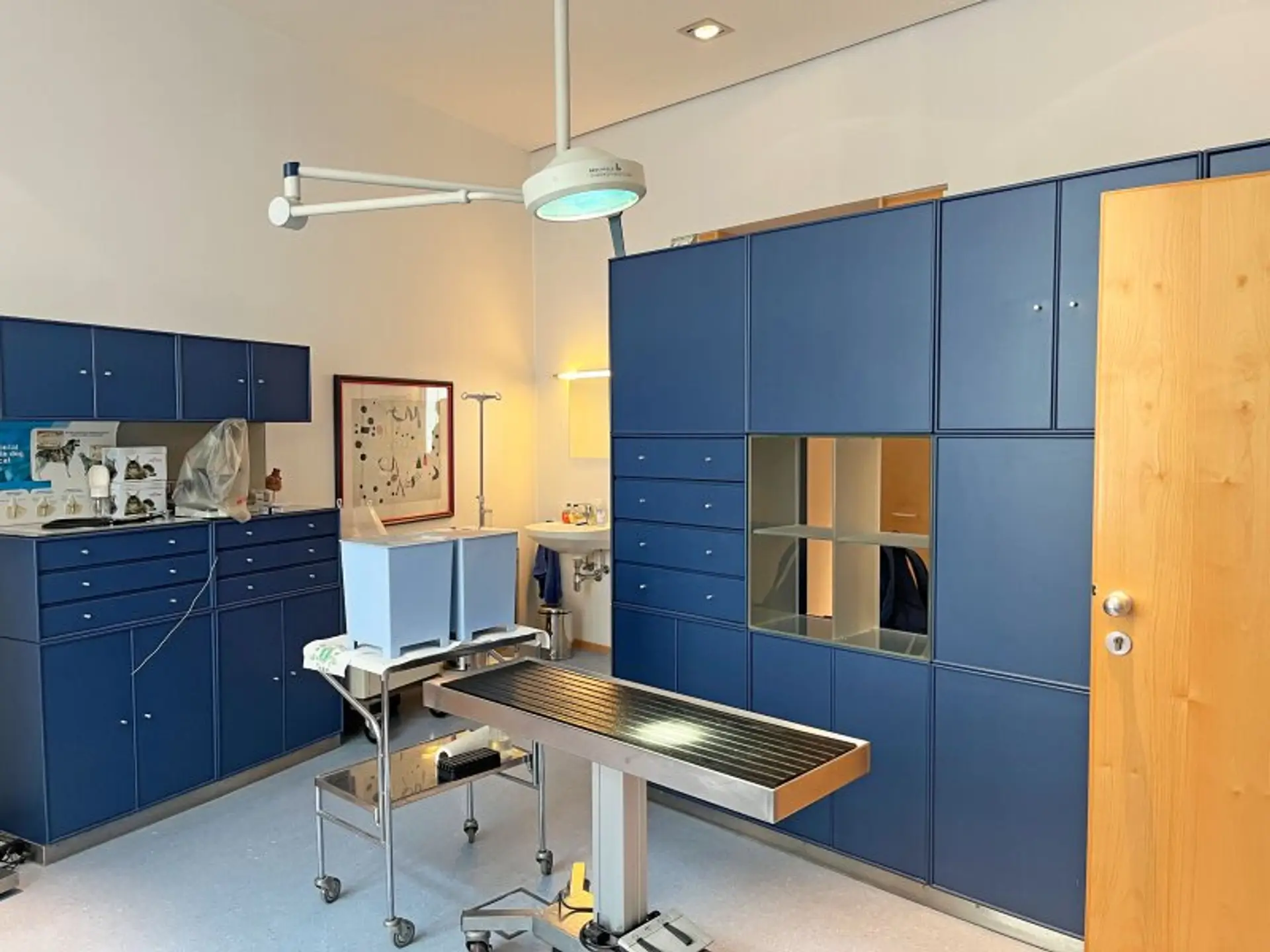 Die hochwertig ausgestattete Praxis mit Vorraum, Warteraum, Ordinationszimmer mit Waschbecken, Labor, Zahnbehandlungsraum, Röntgenraum, Wirtschaftsraum, Dusche und zwei WC's bietet über 69 m² Nutzfläche. Der Empfangsschalter befindet sich zwischen Büro und Warteraum. Für Kunden steht ein WC mit Waschtisch zur Verfügung, weiters gibt es ein WC und eine Dusche für Angestellte der Ordination. Den Personaleingang erreicht man über den Haupteingang des Wohnhauses. Gestaltet und Geplant wurde die Ordination vom Architekten Dipl. Ing. Hans Scheicher. Sämtliches Mobiliar, Innentüren und die straßenseitige Ausgangstüre stammen ebenfalls aus dem Einrichtungshaus Scheicher. Die blauen Kästen sind Designermöbel der dänischen Möbelfirma Montana.