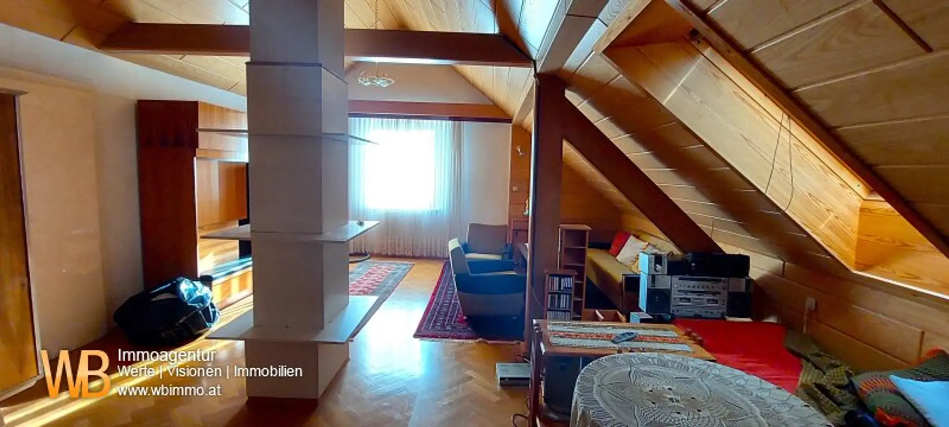 Im hochwertig ausgebauten Dachgeschoß befindet sich das große, ostseitige DG-Wohnzimmer (40m²), ein süd-westseitiges Zimmer mit herrlichem Ausblick, ein Stüberl sowie die große Terrasse (17m²) über dem Garten und Abstellräume in den Dachschrägen.