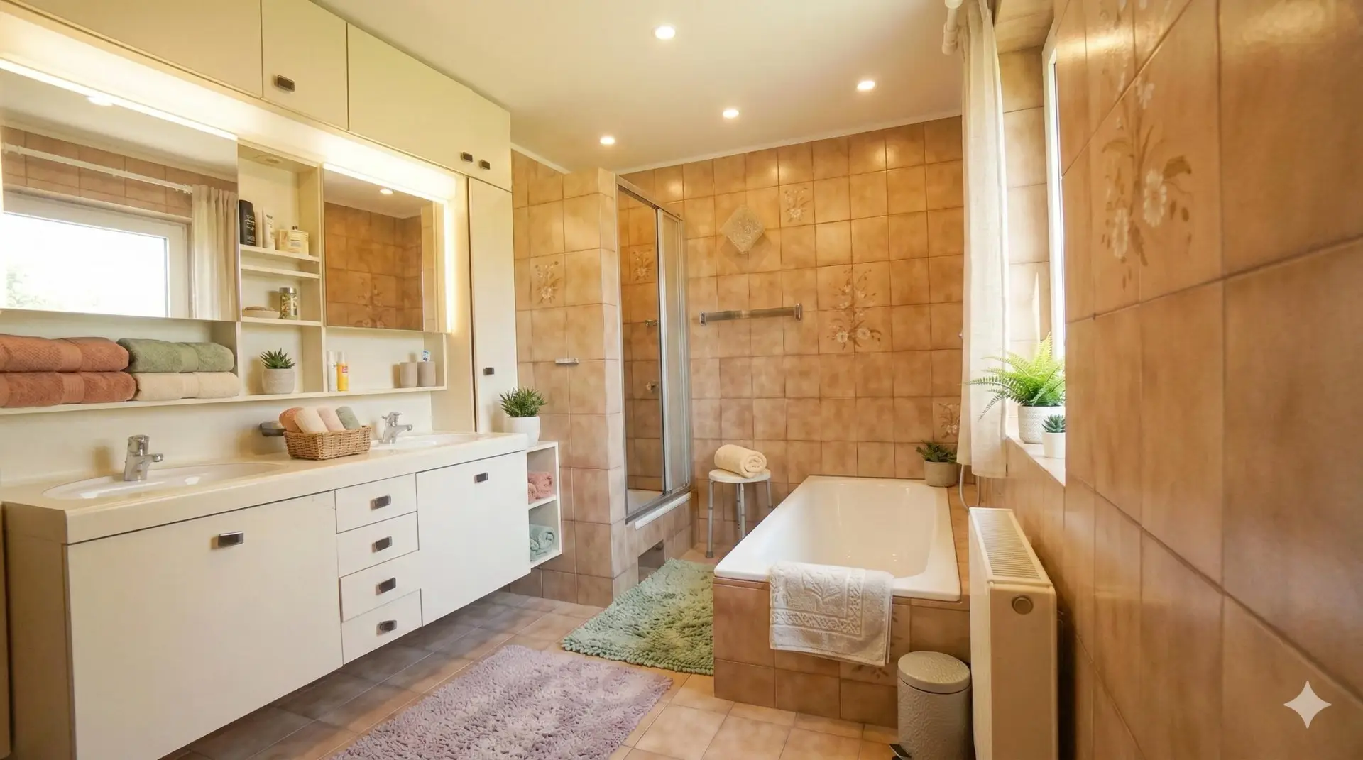 Das großzügige Tageslichtbad besticht durch eine durchdachte Raumaufteilung und viel natürliche Helligkeit.