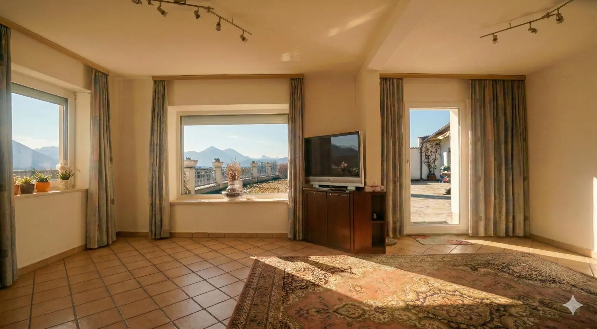 Er bietet direkten Zugang zur angrenzenden Terrasse mit Pool.