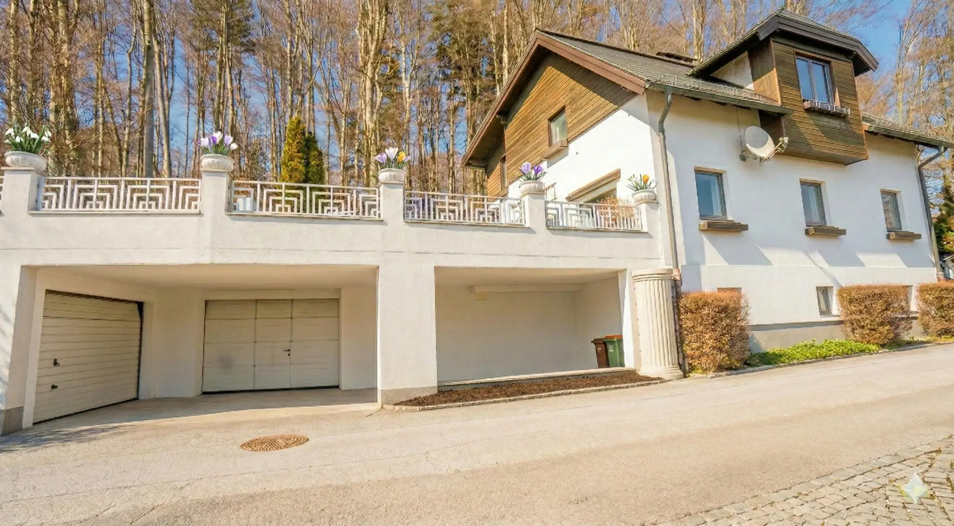 Die integrierte Garage und Überdachung bietet Platz für mehrere Fahrzeuge und schützt diese sicher vor Witterungseinflüssen.