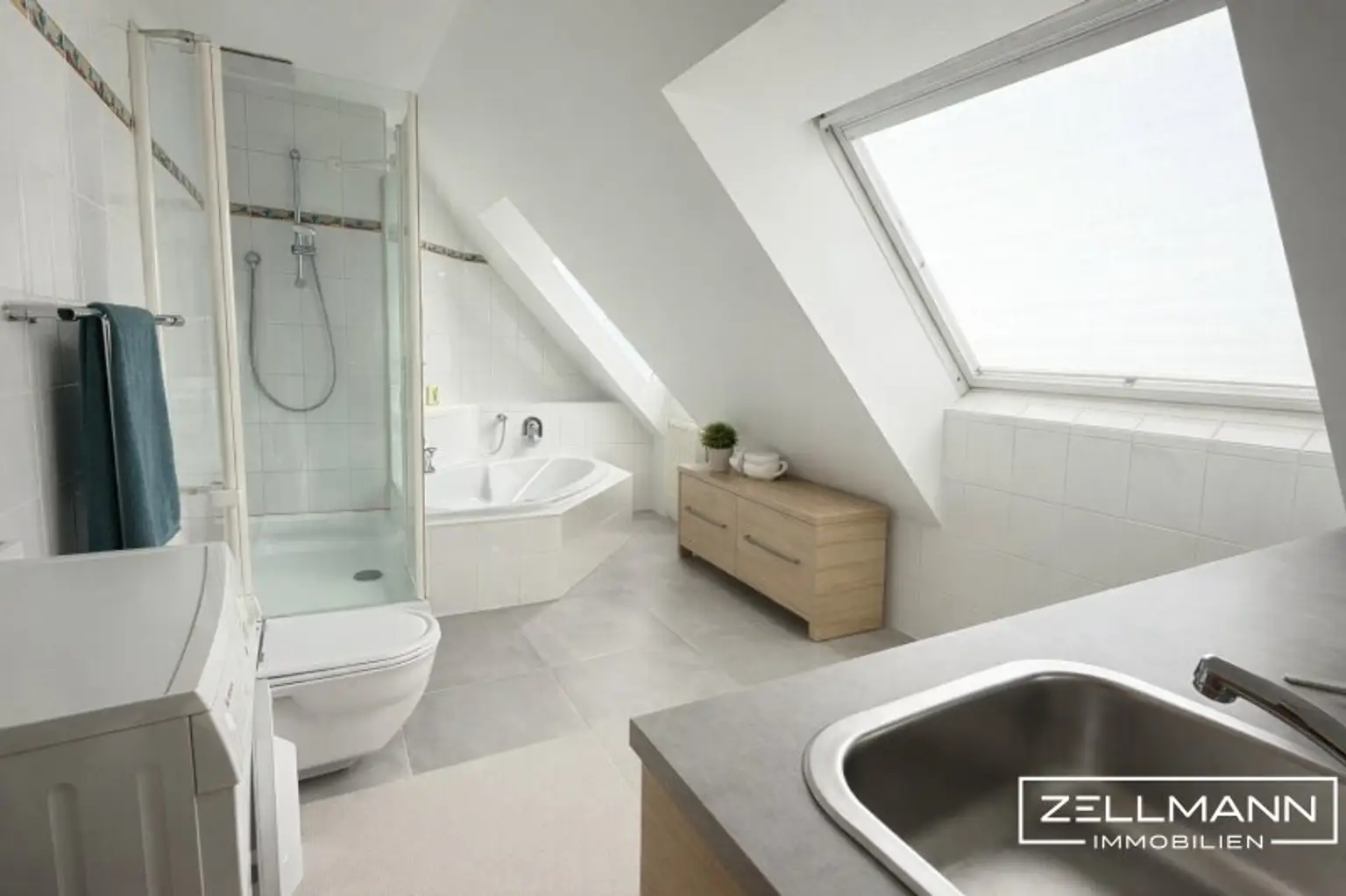Das obere Badezimmer bietet deutlich mehr Großzügigkeit und Komfort. Neben einer Dusche steht hier auch eine Badewanne zur Verfügung. Durch die Dachflächenfenster entsteht eine angenehme natürliche Belichtung, die dem Raum eine helle und freundliche Atmosphäre verleiht.