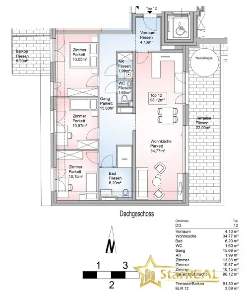 - über die Wendeltreppe oder den Lift ist die Dachterrasse mit ca. 61 m² erschlossen