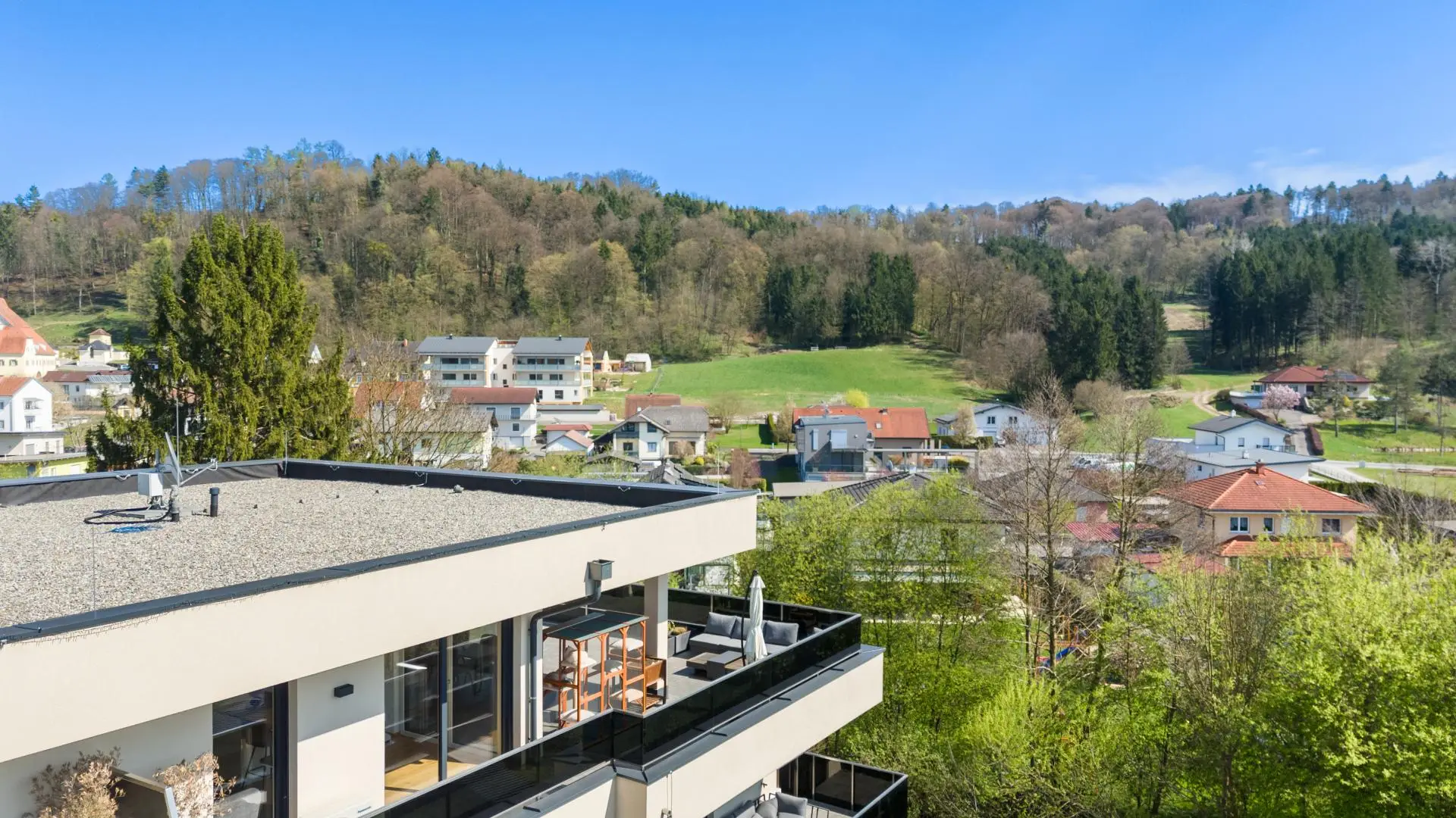Ein besonderes Highlight stellt zweifellos die rund 85 m² große Dachterrasse dar, welche sich zweiseitig ausrichtet und überwiegend von südöstlicher zu südwestlicher Lage erstreckt. Rund 40 m² davon sind überdacht und bieten somit auch bei wechselnden Witterungsverhältnissen einen geschützten Rückzugsort. Die hochwertige Ausführung mit erhöhten Niro-Geländern in Kombination mit elegantem Schwarzglas unterstreicht den exklusiven Charakter dieser Außenfläche. Ergänzt wird das Gesamtbild durch einen eigens verstärkten Bereich für einen Jacuzzi inklusive Strom- und Wasseranschluss sowie einer beeindruckenden Aussicht über die Weiten des Schwarzautals.
