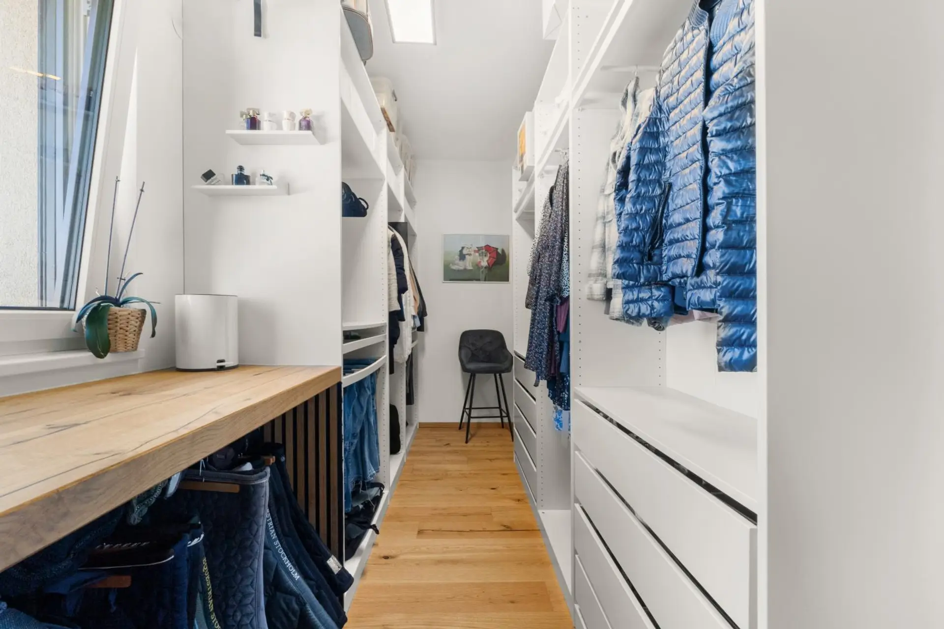Auch im Innenbereich setzt sich der hochwertige Anspruch konsequent fort. Die Bauweise in 38er Ziegel mit zusätzlichem Vollwärmeschutz von 16cm, dreifach verglaste Kunststofffenster der Marke Josko in Großteils großzügiger Panoramaausführung mit Tönungsfolierung, elektrische Rollläden, teilweise ergänzende Plissees sowie vollwertiger Insektenschutz schaffen ein durchdachtes Gesamtpaket. Für ein angenehmes Raumklima sorgen Split-Klimageräte im Wohn- und Schlafbereich sowie eine komfortable Fußbodenheizung. Moderne SmartControl-Lösungen für Licht und weitere Funktionen runden das technische Niveau ab.
