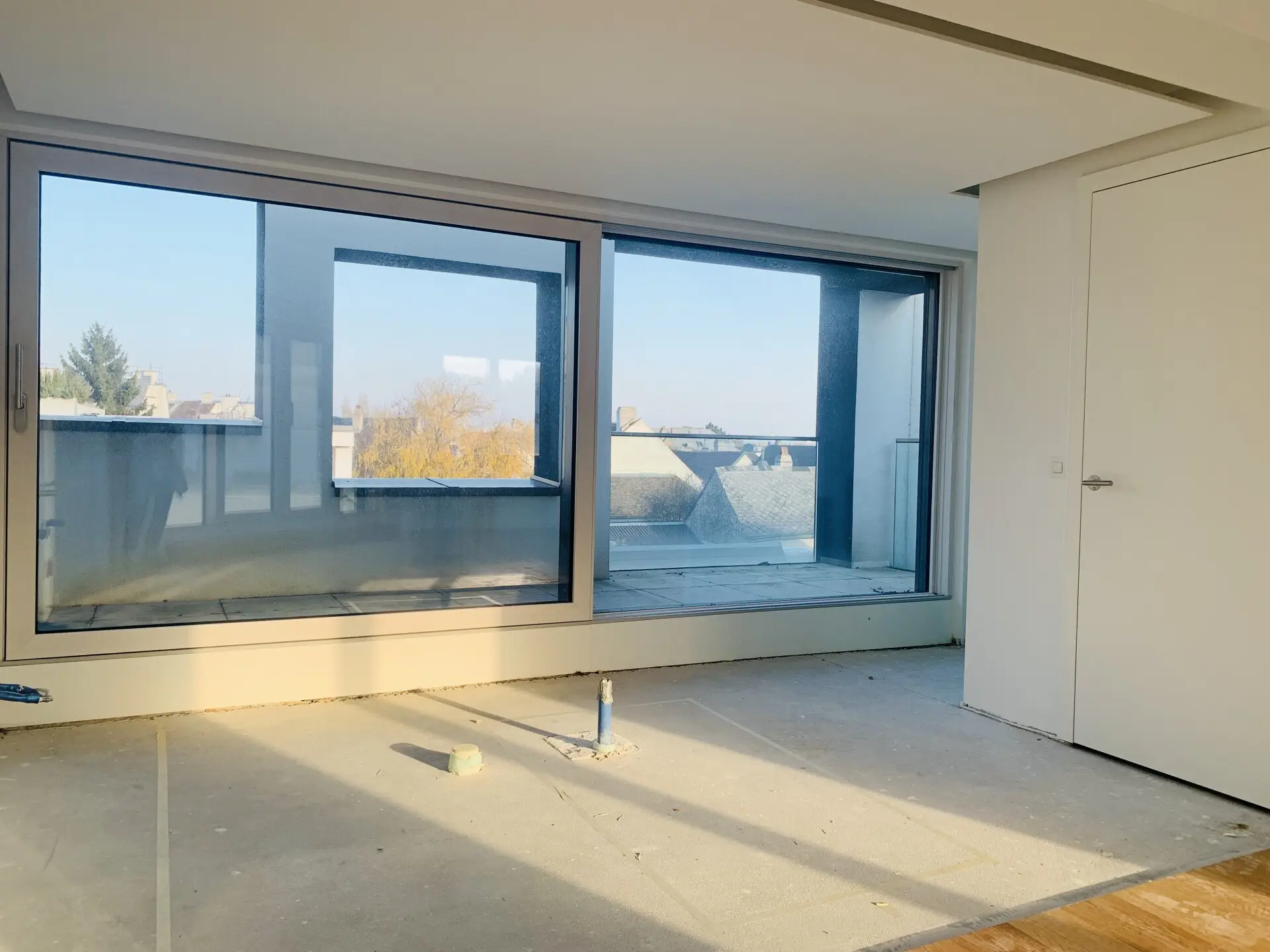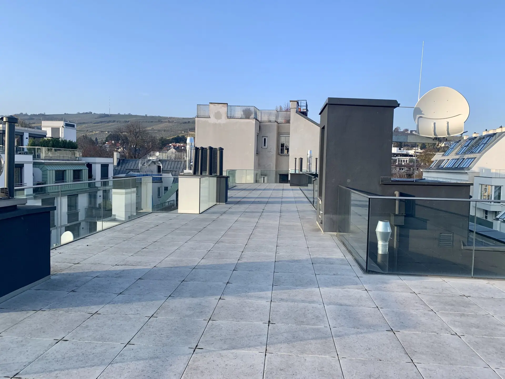 Über die Terrasse vom Wohnzimmer gelangt man auf die riesige Dachterrasse mit ca.160 m² und herrlicher Aussicht.