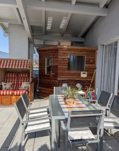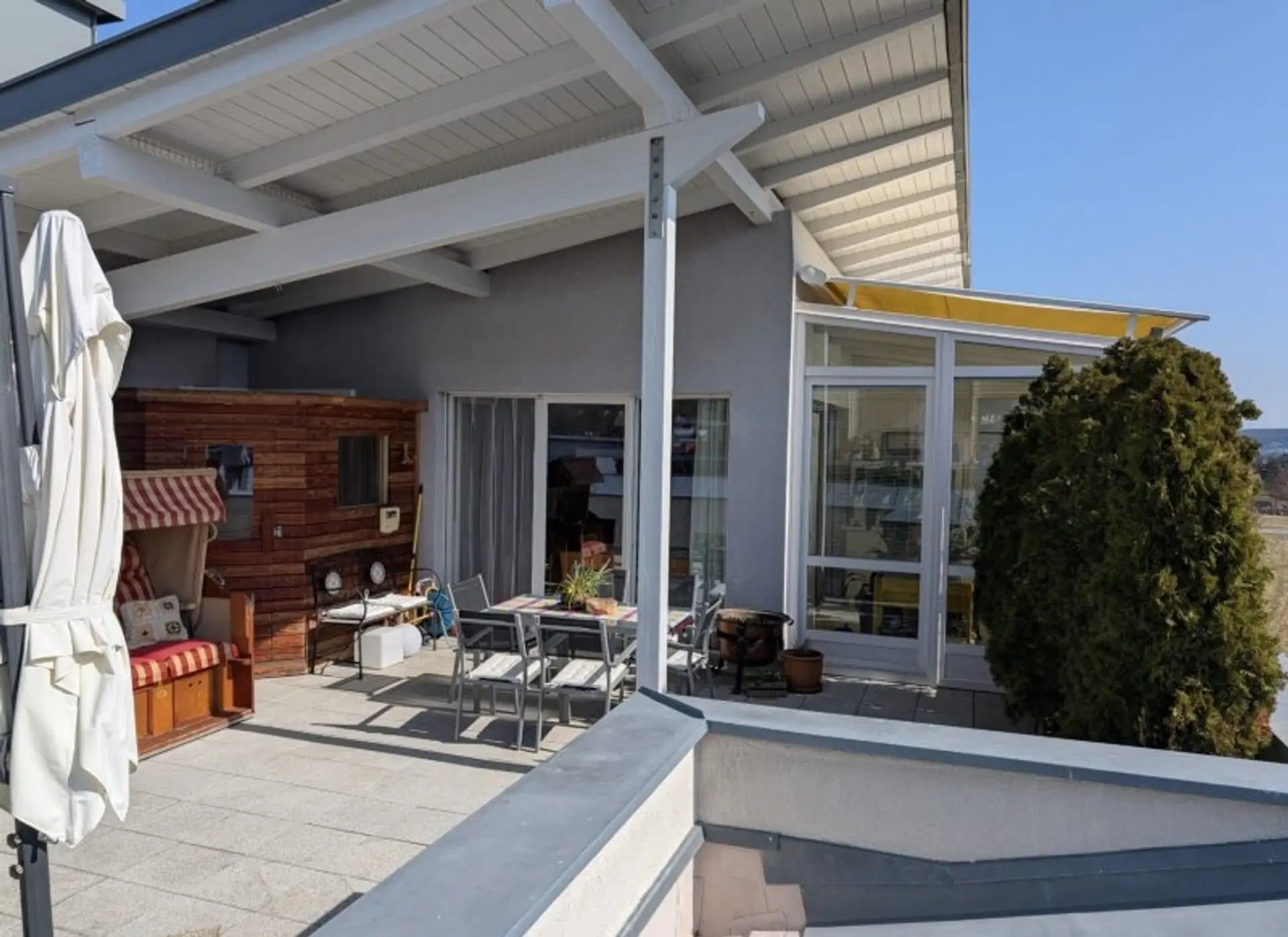 Die großzügige Terrasse liegt Richtung Süden, von wo sie einen beeindruckenden Bergblick, Fernblick und einen herrlichen Grünblick genießen können – perfekte Voraussetzungen für entspannte, blickgeschützte Stunden im Freien, auch mit Wintersonne und Sauna.