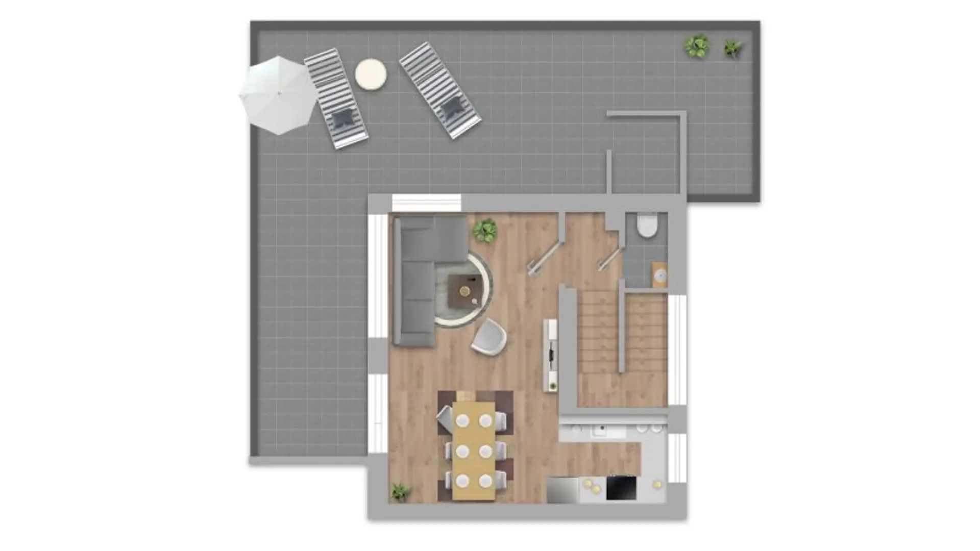In der Etage darüber befindet sich das großzügige Wohn-Esszimmer, welches mit seinem wunderbaren Bergblick überzeugt. Die Küche mit Fenster ist unmittelbar angeschlossen, auch ein WC befindet sich auf dieser Ebene. Über das Wohnzimmer betreten Sie auch die großzügige Terrasse, welche nach Süd-Westen ausgerichtet ist und mit elektrischen Markisen ausgestattet ist. Hier verbringen Sie laue Sommerabende mit Familie und Freunden.