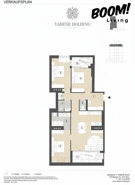 Die Angaben über das angebotene Objekt erfolgen mit der Sorgfalt eines ordentlichen Immobilienmaklers; für die Richtigkeit solcher Angaben, die auf Informationen der über das Objekt Verfügungsberechtigten beruhen, wird keine Gewähr geleistet. Es gelten die Bestimmungen der beiliegenden Immobilienmaklerverordnung; des Weiteren wurde die Übersicht der zu erwartenden Nebenkosten gem. KSchG übermittelt. Gemäß § 6 Abs. 4 dritter Satz MaklerG und § 30b KSchG weist der Immobilienmakler auf ein bestehendes wirtschaftliches Naheverhältnis zu dem Verkäufer aufgrund regelmäßiger geschäftlicher Tätigkeit hin. Es besteht jedoch keinerlei gesellschaftsrechtliche Verbindung zum Verkäufer. Dieses Angebot ist ausschließlich für den Adressaten bestimmt. Eine Weitergabe an Dritte ist nur mit unserer ausdrücklichen, in Schriftform übermittelten, Zustimmung gestattet. Hinweis: Seit 1.1.2009 besteht für den Verkäufer bzw. den Vermieter einer Immobilie die Verpflichtung zur Vorlage eines gültigen Energieausweises. Im Falle der Nichtvorlage gilt eine dem Alter und der Art des Gebäudes entsprechende Gesamtenergieeffizienz als vereinbart. Der Vermittler, die Boom Living GmbH & Co KG, ist als Doppelmakler tätig.
