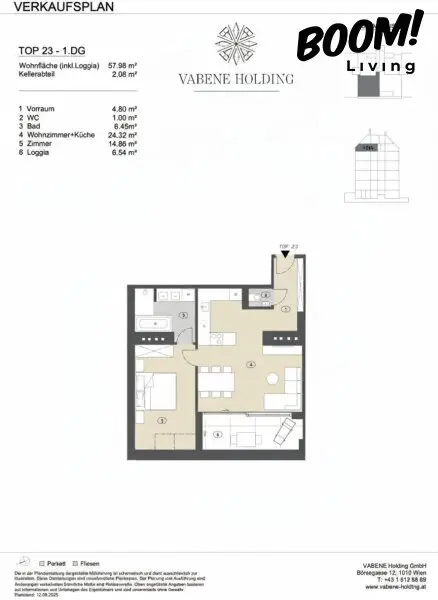 Die Einheit Top 23 verfügt über eine Wohnfläche von ca. 57,98 m² inklusive Loggia mit ca. 6,54 m² sowie ein Kellerabteil mit ca. 2,08 m², das im Kaufpreis inkludiert ist.