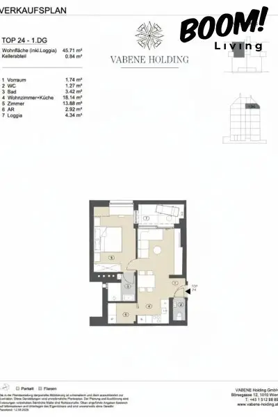 Die Angaben über das angebotene Objekt erfolgen mit der Sorgfalt eines ordentlichen Immobilienmaklers; für die Richtigkeit solcher Angaben, die auf Informationen der über das Objekt Verfügungsberechtigten beruhen, wird keine Gewähr geleistet. Es gelten die Bestimmungen der beiliegenden Immobilienmaklerverordnung; des Weiteren wurde die Übersicht der zu erwartenden Nebenkosten gem. KSchG übermittelt. Gemäß § 6 Abs. 4 dritter Satz MaklerG und § 30b KSchG weist der Immobilienmakler auf ein bestehendes wirtschaftliches Naheverhältnis zu dem Verkäufer aufgrund regelmäßiger geschäftlicher Tätigkeit hin. Es besteht jedoch keinerlei gesellschaftsrechtliche Verbindung zum Verkäufer. Dieses Angebot ist ausschließlich für den Adressaten bestimmt. Eine Weitergabe an Dritte ist nur mit unserer ausdrücklichen, in Schriftform übermittelten, Zustimmung gestattet. Hinweis: Seit 1.1.2009 besteht für den Verkäufer bzw. den Vermieter einer Immobilie die Verpflichtung zur Vorlage eines gültigen Energieausweises. Im Falle der Nichtvorlage gilt eine dem Alter und der Art des Gebäudes entsprechende Gesamtenergieeffizienz als vereinbart. Der Vermittler, die Boom Living GmbH & Co KG, ist als Doppelmakler tätig.