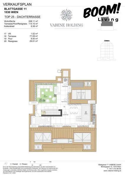Die Angaben über das angebotene Objekt erfolgen mit der Sorgfalt eines ordentlichen Immobilienmaklers; für die Richtigkeit solcher Angaben, die auf Informationen der über das Objekt Verfügungsberechtigten beruhen, wird keine Gewähr geleistet. Es gelten die Bestimmungen der beiliegenden Immobilienmaklerverordnung; des Weiteren wurde die Übersicht der zu erwartenden Nebenkosten gem. KSchG übermittelt. Gemäß § 6 Abs. 4 dritter Satz MaklerG und § 30b KSchG weist der Immobilienmakler auf ein bestehendes wirtschaftliches Naheverhältnis zu dem Verkäufer aufgrund regelmäßiger geschäftlicher Tätigkeit hin. Es besteht jedoch keinerlei gesellschaftsrechtliche Verbindung zum Verkäufer. Dieses Angebot ist ausschließlich für den Adressaten bestimmt. Eine Weitergabe an Dritte ist nur mit unserer ausdrücklichen, in Schriftform übermittelten, Zustimmung gestattet. Hinweis: Seit 1.1.2009 besteht für den Verkäufer bzw. den Vermieter einer Immobilie die Verpflichtung zur Vorlage eines gültigen Energieausweises. Im Falle der Nichtvorlage gilt eine dem Alter und der Art des Gebäudes entsprechende Gesamtenergieeffizienz als vereinbart. Der Vermittler, die Boom Living GmbH & Co KG, ist als Doppelmakler tätig.