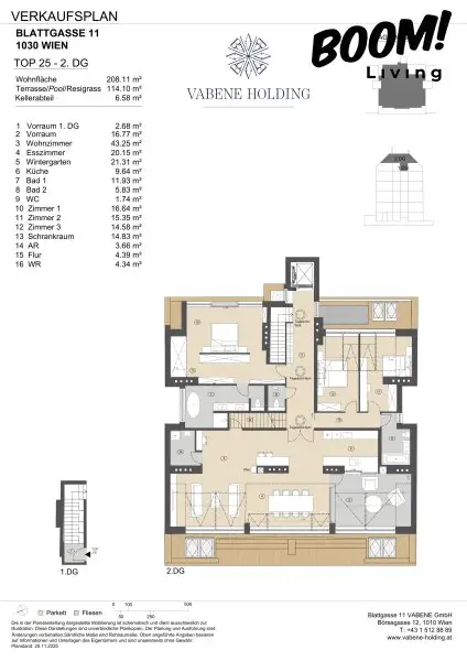 Die Einheit Top 25 erstreckt sich über zwei Ebenen und verfügt über eine beeindruckende Wohnfläche von ca. 208,10 m² sowie ein Kellerabteil mit ca. 4,80 m², das im Kaufpreis inkludiert ist.